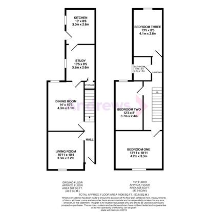 The property is end terraced and has a large garden which is divided into two parts (front part with some sheds and back part grassed area). The accommodation comprises of; living room to the front, dining room, study room between the kitchen and dining room, kitchen to the rear which access onto the garden. Upstairs is three double bedroom with the master to the front and and family bathroom along with loft access on the landing.