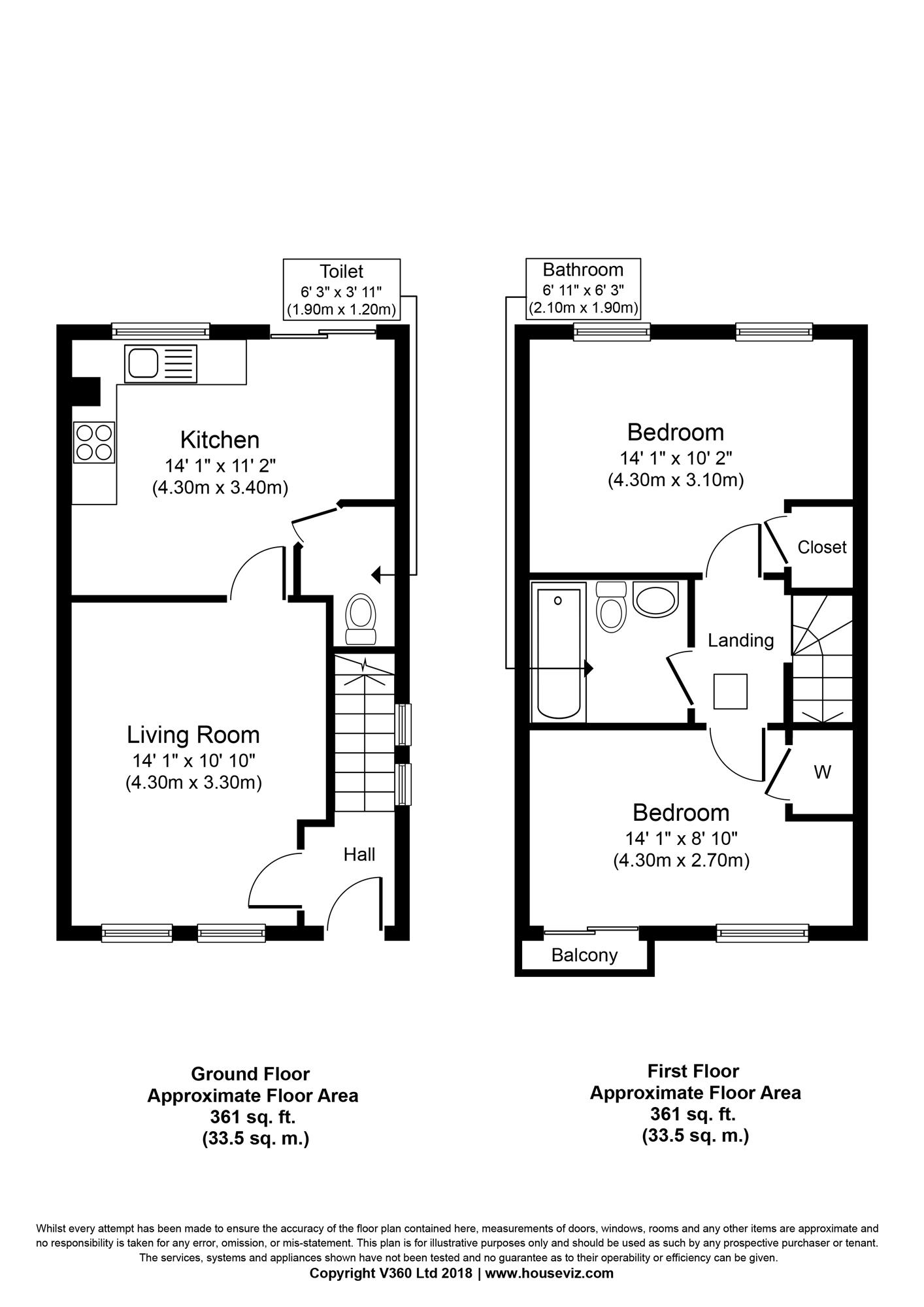 Bedroom 1: 14’ 1” (4.30m) x 8’ 10” (2.70m)