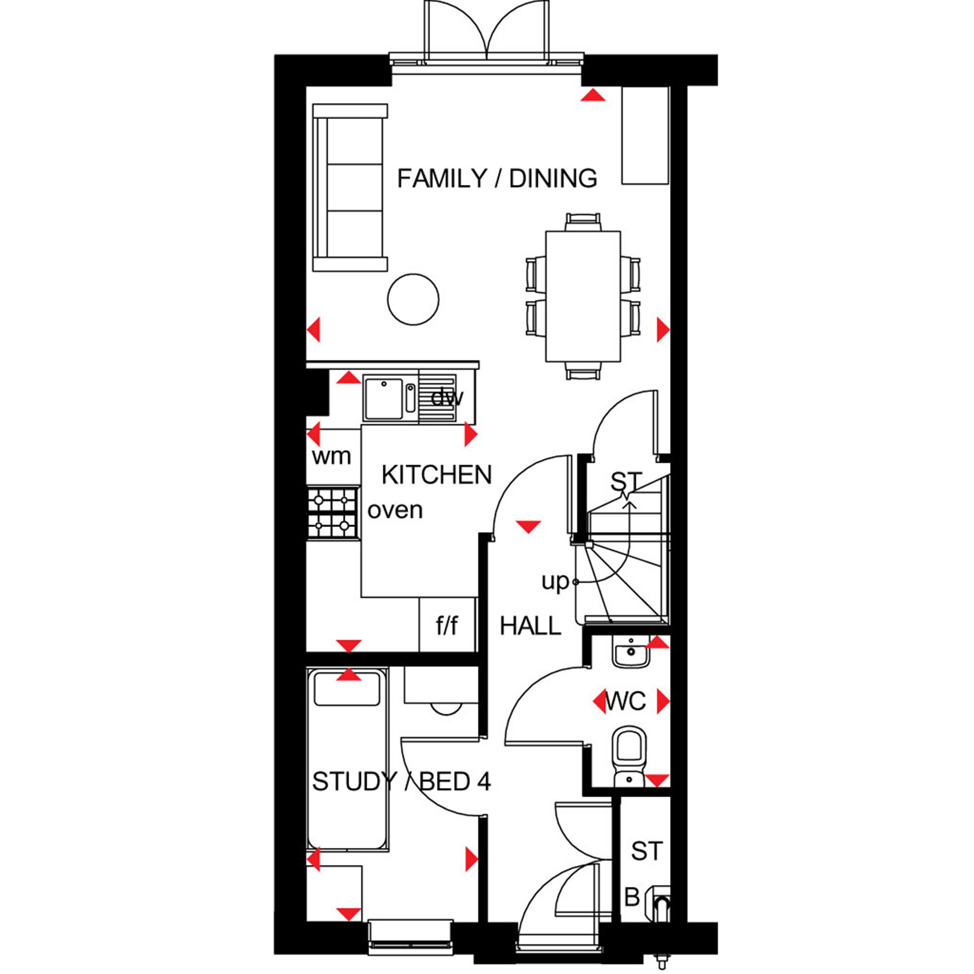 The Kingsville is a bright and flexible 3/4 bedroom, 3-storey home. Downstairs is a stylish kitchen with family and dining areas and the fourth bedroom, which can be used as a study. On the first floor you'll find the relaxing lounge area and the spacious master bedroom, with an en suite. Upstairs to the second floor you'll find a double bedroom, a single bedroom and family bathroom.