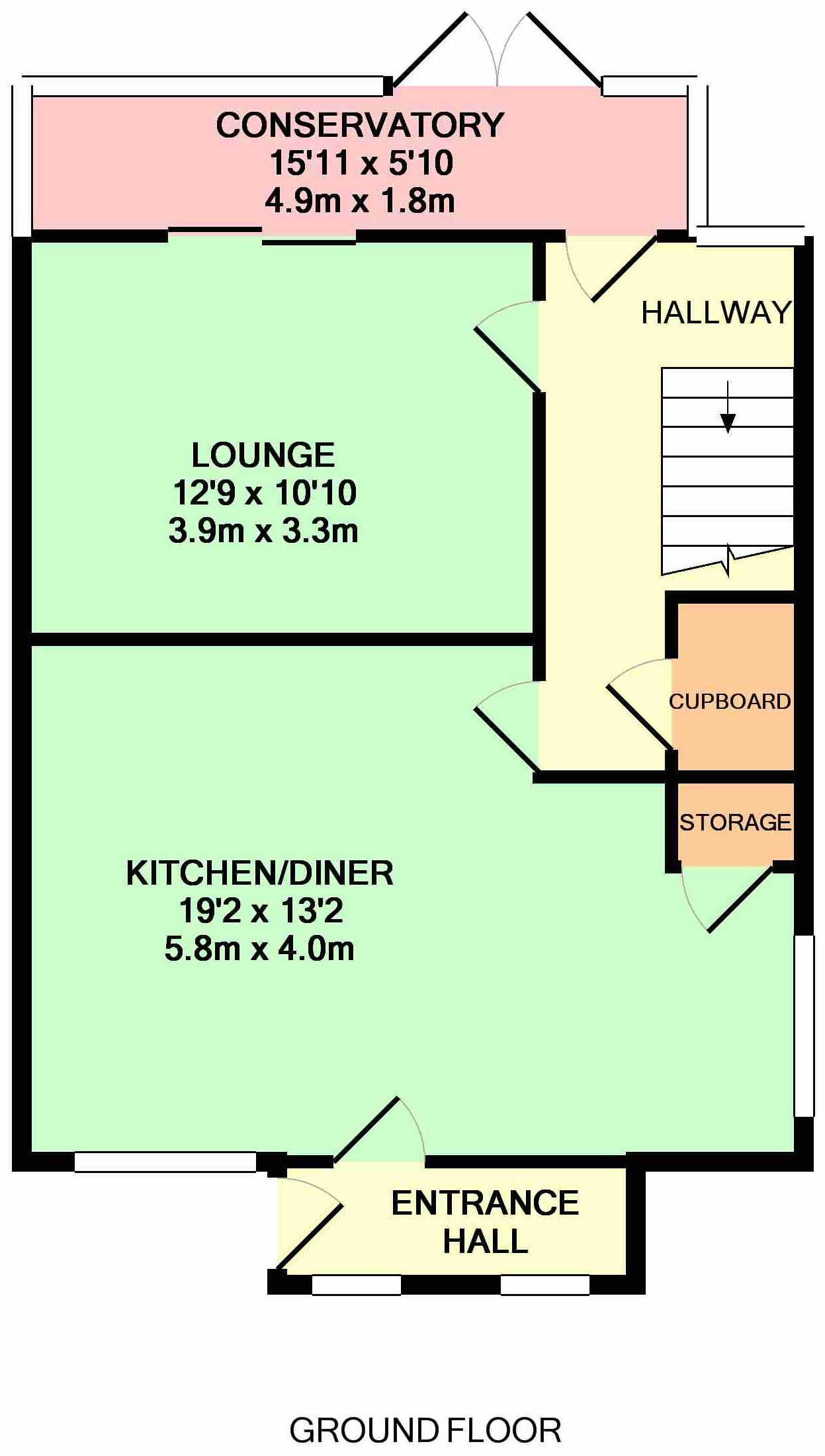 UPVC D.G. Conservatory: 15ft 11 inches x 5ft 10 inches [4.85 x 1.78 m] Polycarbonate roof, uPVC double glazed window and French doors out onto rear garden, ceramic tiled floor.