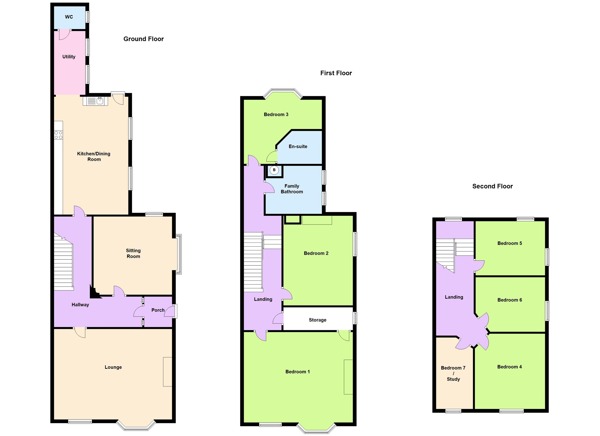 The property is spacious and the ground floor comprises of porch, entrance hall, lounge, sitting room, a modern kitchen diner, utility area and cloakroom. To the first floor are Three bedrooms and family bathroom. One of the bedrooms benefiting from its own en suite shower room, while the master has a walk-in storage room with potential for either en suite (under-floor plumbing already installed) or dressing room. The second floor comprises of a further Four bedrooms.