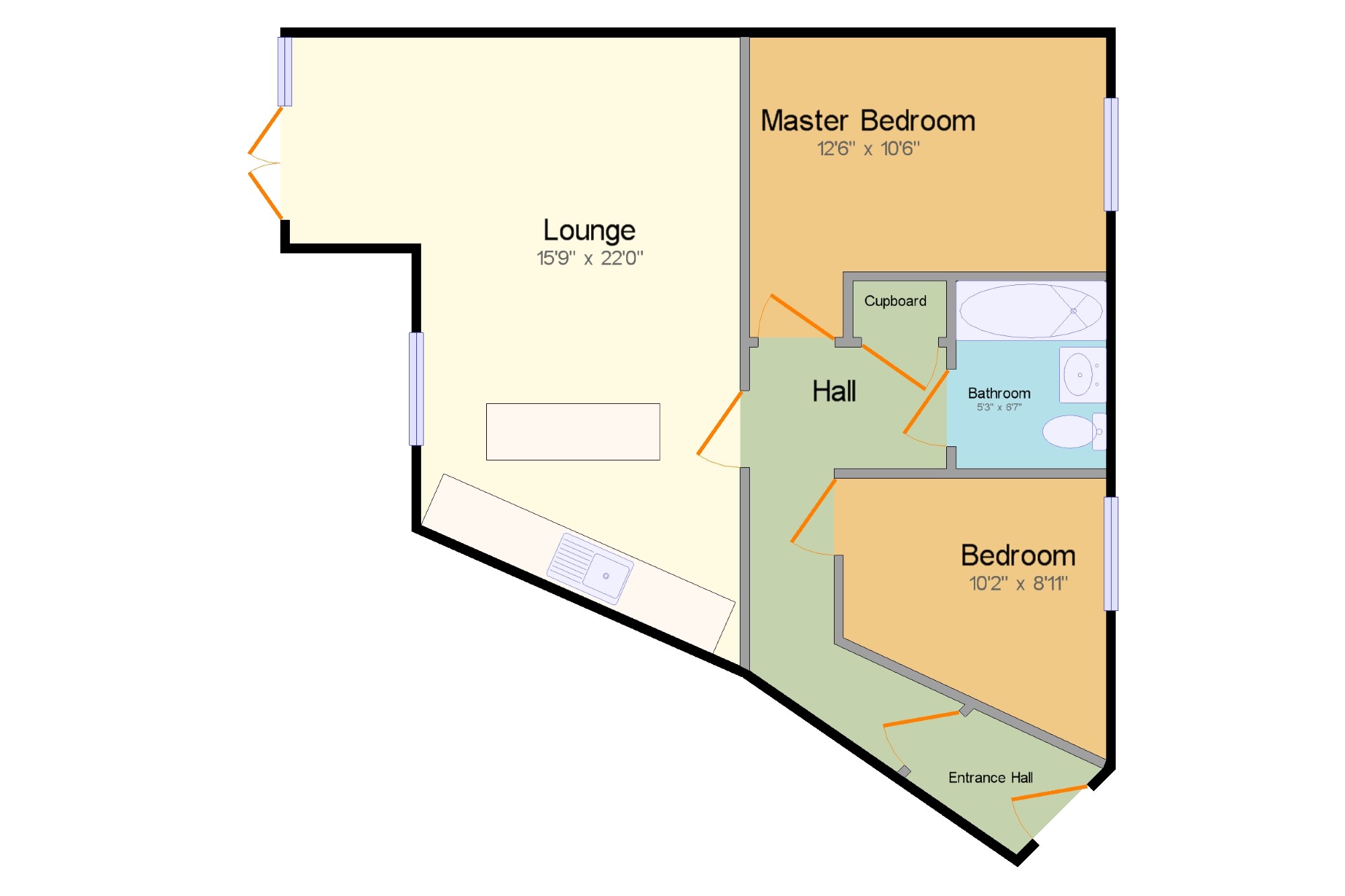 Lounge/Kitchen15'9" x 22' (4.8m x 6.7m). The kitchen area has granite effect work surface, built in matching wall and base units, stainless steel sink with drainer, integrated electric oven with electric hob and overhead extractor canopy. Space for fridge freezer. Breakfast bar with stools beneath. The lounge area has patio double glazed door opening onto Juliette balcony, double glazed window, electric heater, carpeted flooring and ceiling light.