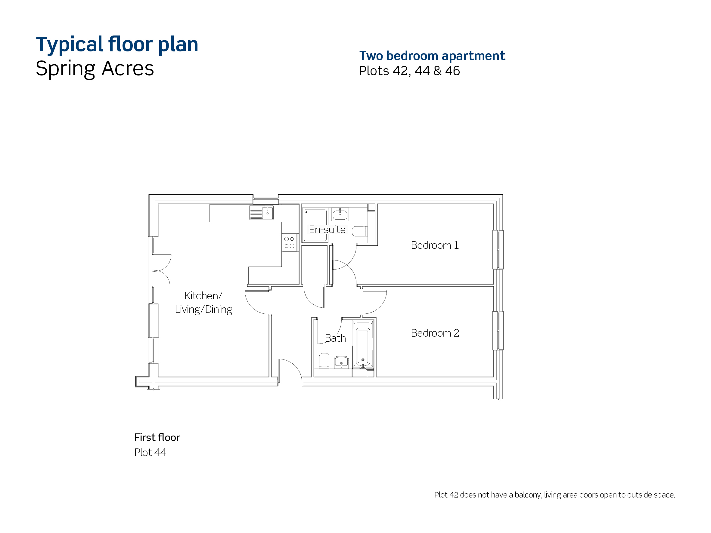 Kitchen/Living/Dining Fitted kitchen with oven, hob and extractor, sink with draining board, vinyl flooring. Double glazed window. Opens to living area with TV and telephone points, double glazed window and doors opening to outside space (42) or Juliet balcony (44,46).