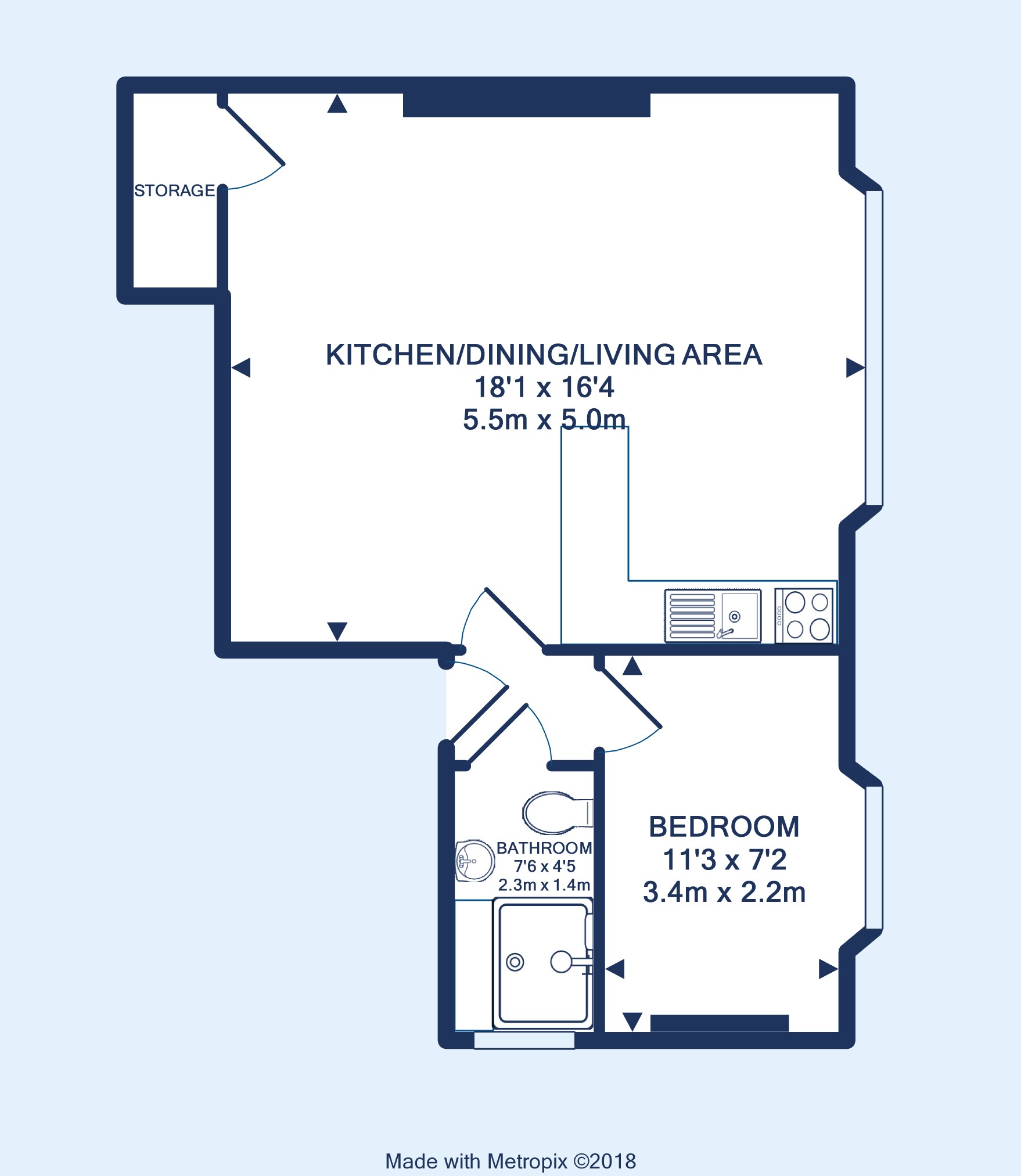 The entrance hall leads to a bedroom with front facing window (westerly aspect). The bathroom has a large walk in shower, white suite and side window. The impressive 18'1 x 16'4 open plan living area has three front facing windows with westerly aspect, modern kitchen area and wood burner. There is also a spacious walk in storage cupboard.