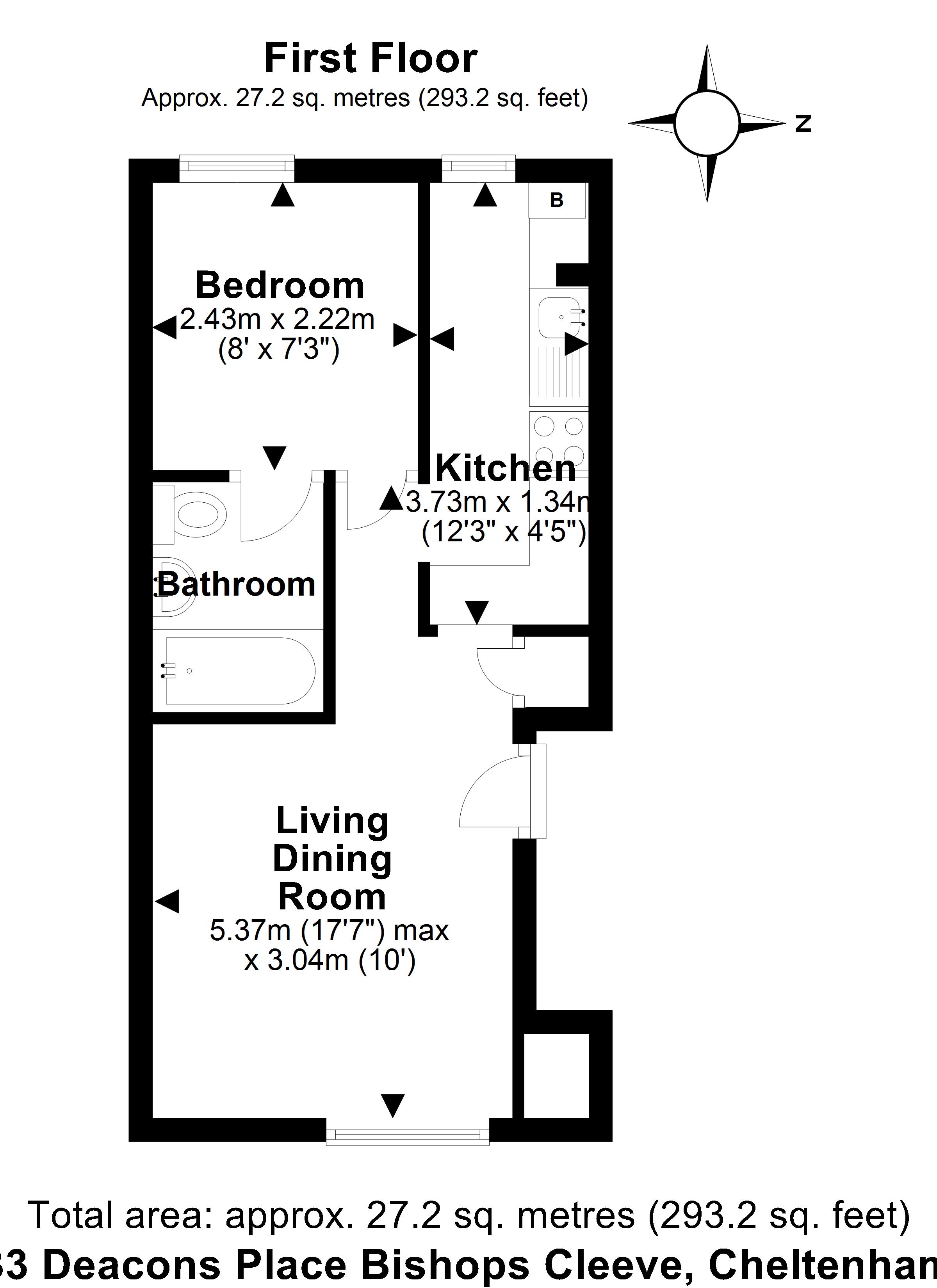 A well presented one bedroom first floor apartment with allocated parking space in Bishops Cleeve close to ge Aviation. The accommodation comprises communal entrance door, stairs to first floor, door into No.33, living room, kitchen, bedroom with hatch to large loft space and bathroom.