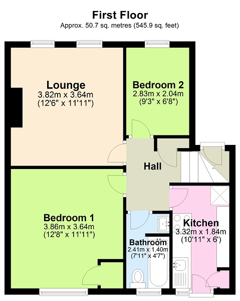 Bedroom 1 (12' 8" x 11' 11" or 3.86m x 3.64m)