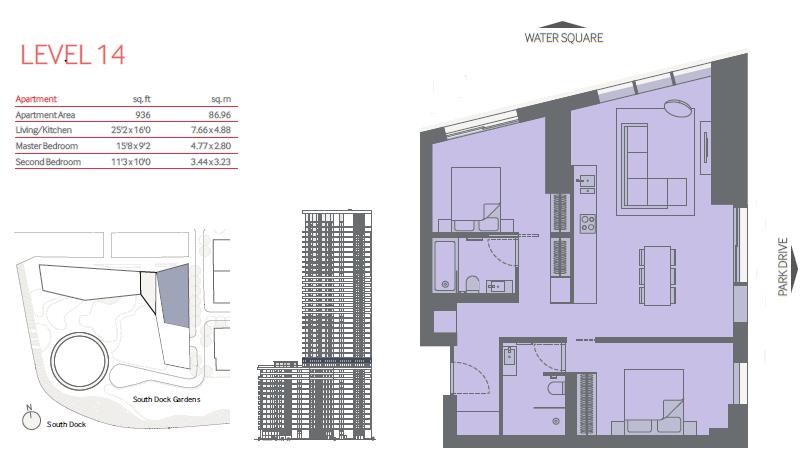Luxurious 14th floor (936 Sq. Ft) two bedroom apartment, offering dual aspect North/East skyline views of Royal Victoria & The O2. Designed by world-renowned architectural practice Stanton Williams, 10 Park Drive is the first of the new residential developments to be built on the Canary Wharf Estate. It sits adjacent to South Dock, linked to the water by beautifully landscaped gardens & parks.
