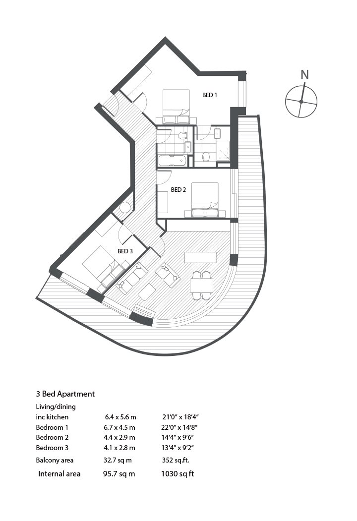 An impressive 1032 Sq. Ft. Three double bedroom apartment finished to a high standard throughout, an open plan Lounge/Kitchen with integrated appliances, perfect for entertaining guests as you overlook Royal Victoria Docks.