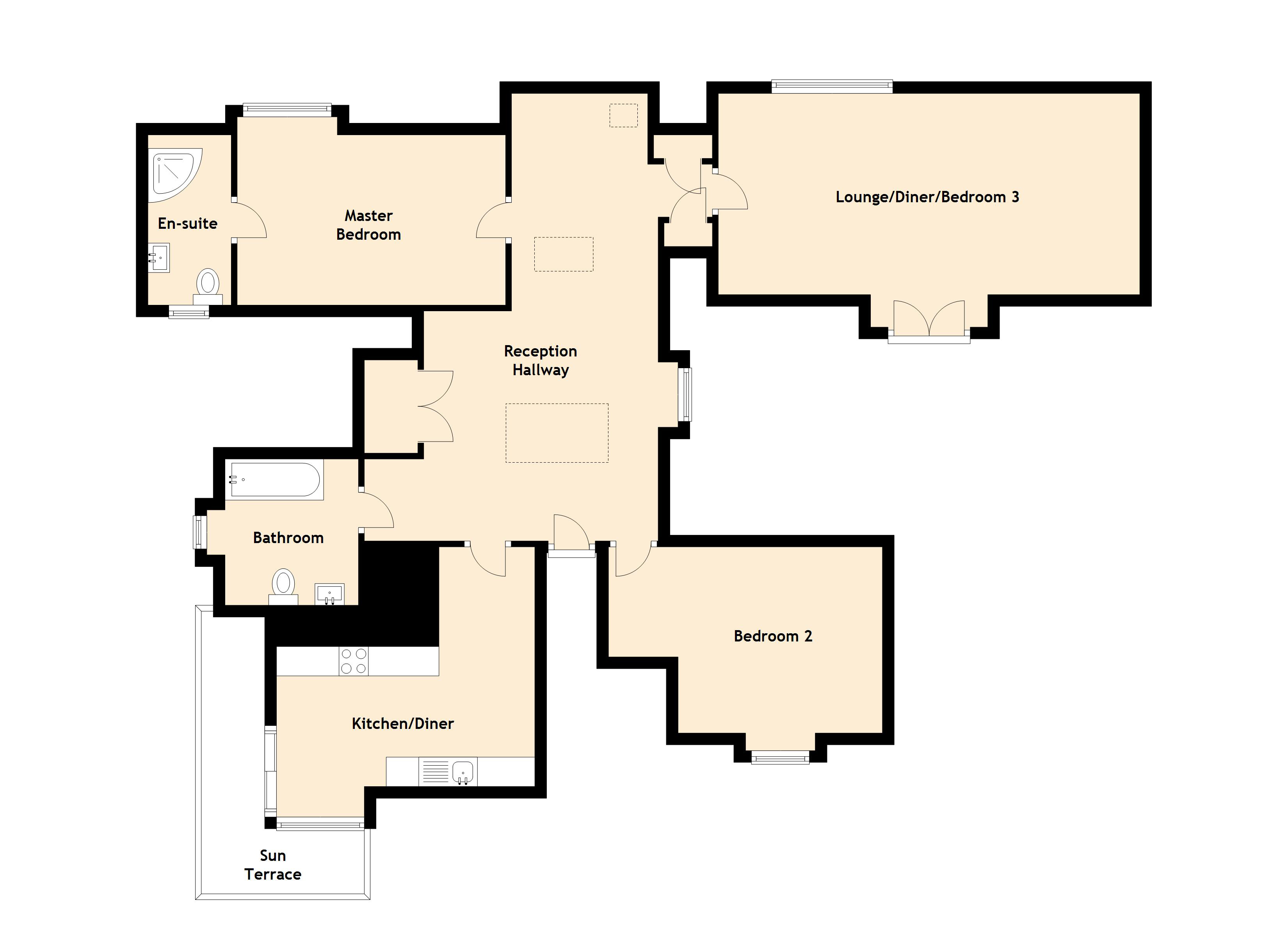 The immediately impressive dual aspect lounge/diner has a Juliette balcony that floods the room with natural light and provides a fantastic focal point, offering views of the surrounding area. This room could also be used as a third bedroom if required. The kitchen/diner includes a good range of modern floor and wall mounted units, with a complementary worktop. It further benefits from an integrated oven, hob, extractor, fridge freezer and washing machine. There is space for a small dining table for more informal gatherings. Patio doors open from here onto the ‘L’ shaped sun-terrace, which is a glorious spot for a lazy summer’s day.