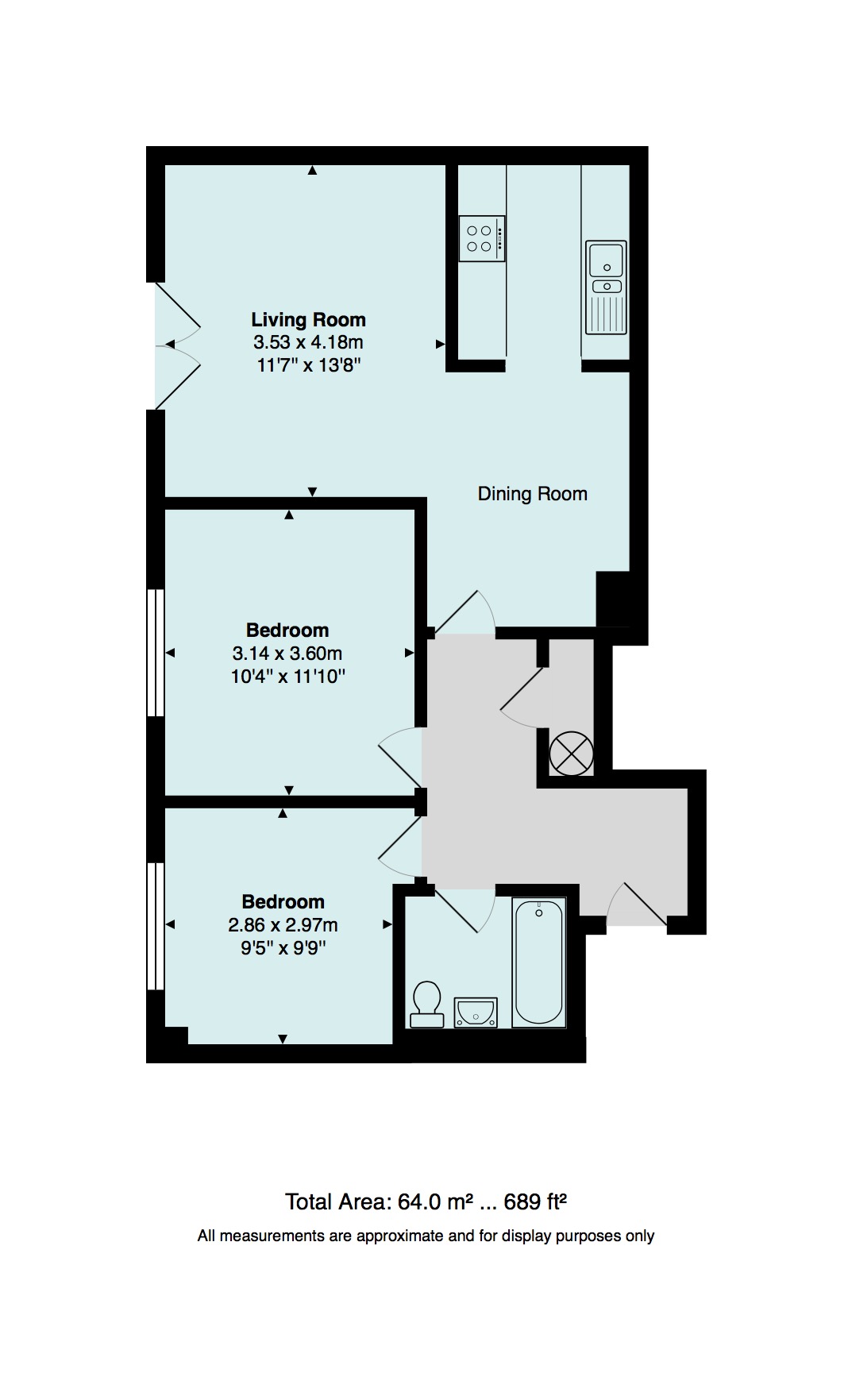 This share of freehold property is a spacious 688 located at the back of a secure building and therefore provides a very quiet location. It boasts a large living space with a Juliet balcony and dining area, a very cool separate contemporary stainless steel kitchen with integral appliances, 2 good sized double bedrooms and a well appointed bathroom.