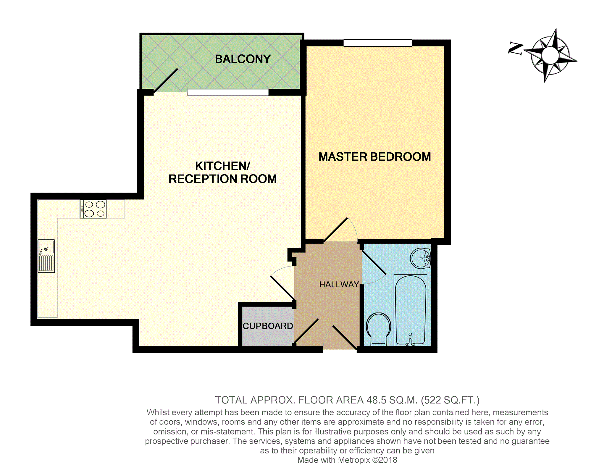 The property comprises of: Entrance hallway with walk in cupboard (housing the boiler), a modern open plan living / dining room, an integrated kitchen, a large private balcony, a master bedroom and contemporary bathroom with shower over bath.