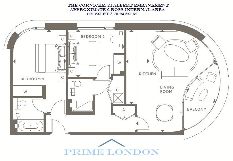 A bright and modern south facing 821 sq ft two bedroom apartment with balcony, available for sale through Prime London in The Corniche, 24 Albert Embankment. The apartment also comes fully furnished at asking price and is available chain free.