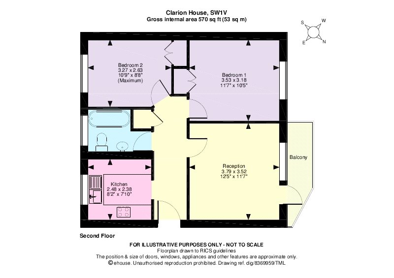 There is a light reception room, which benefits from a door opening onto a southwest-facing balcony overlooking Moreton Place. The kitchen has an integrated gas hob with extractor fan, and an oven, plus space for all of the necessary household appliances, while both bedrooms are doubles, with fitted storage.