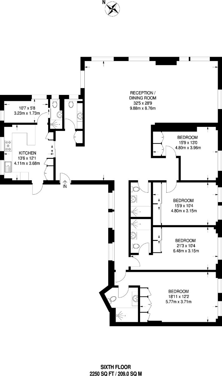 A bright and spacious four bedroom apartment on the sixth floor of a portered, purpose built block benefiting from both passenger lift and 24 hour porter. Comprising four bedrooms, large reception room with space for dining, separate kitchen, two shower rooms and cloakroom this property offers generous accommodation.