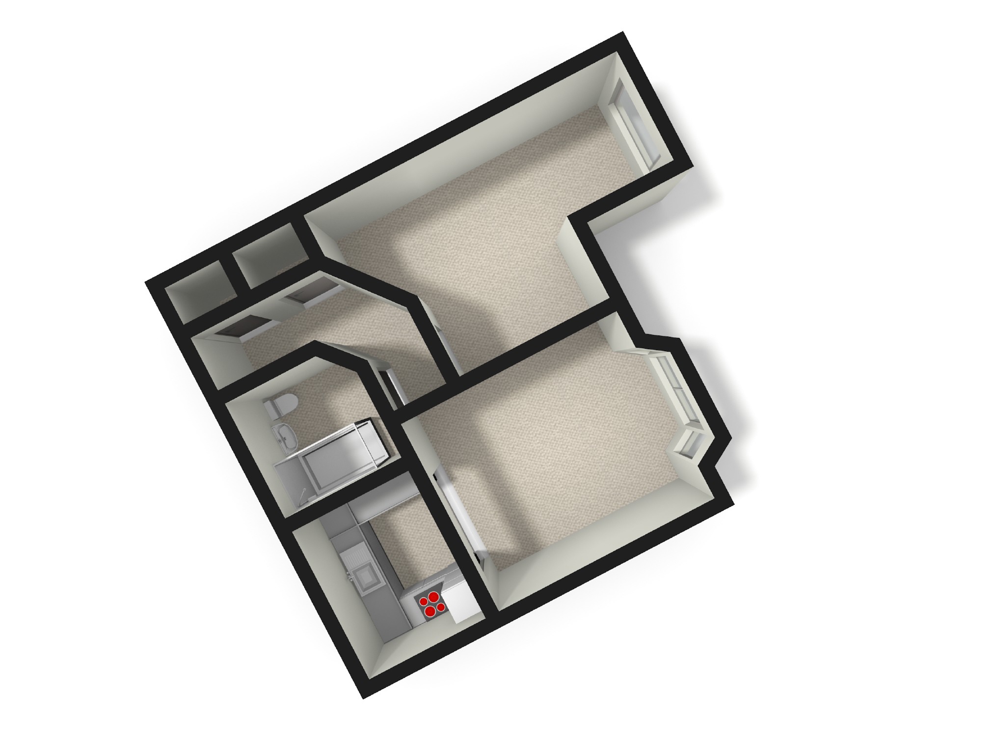 Carpet, a range of base and wall units with roll top work-surface, stainless steel sink and drainer, four ring hob and electric oven.