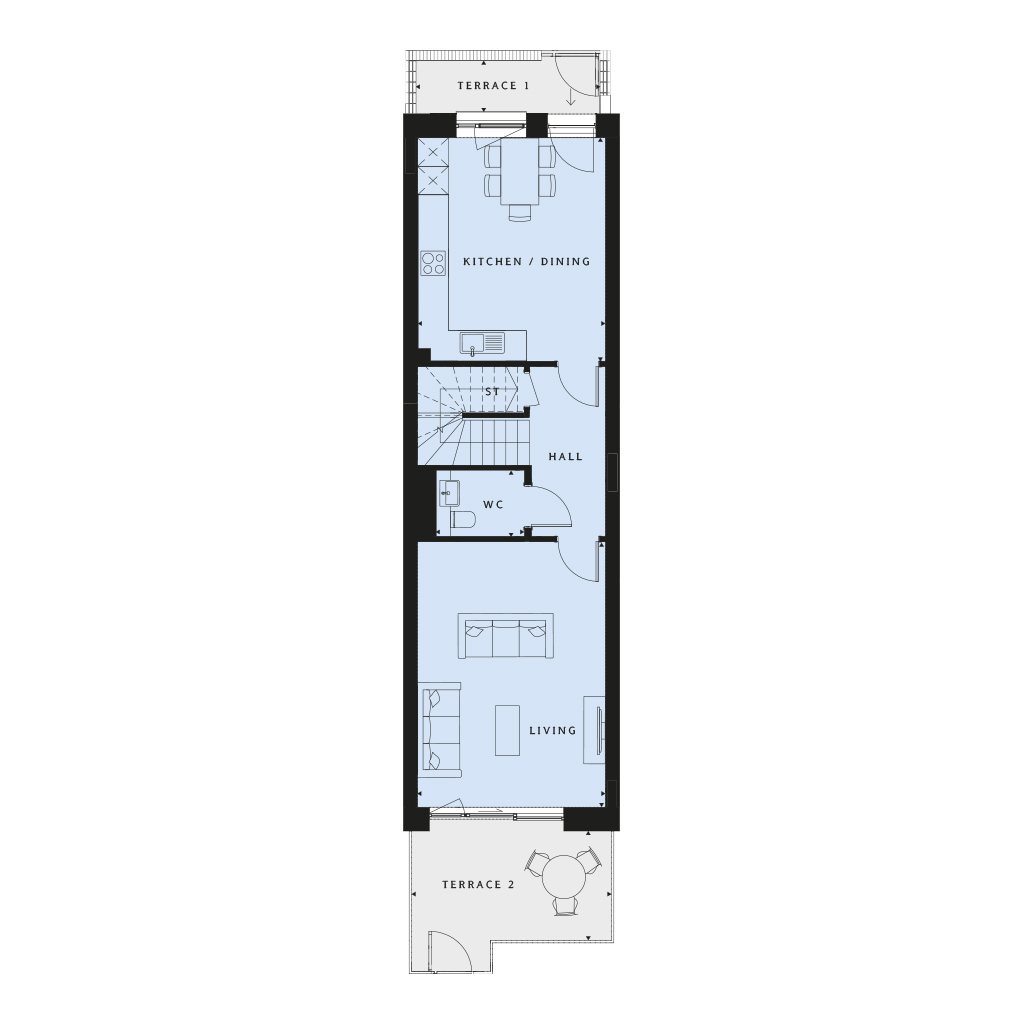An attractive 3-bedroom duplex home situated on the ground and first floor. There are two terraces; one accessed from the kitchen/dining area and the other from the separate living space. Upstairs there are 3 double bedrooms, a family bathroom with the master featuring an en suite with shower. Available with Help to Buy, parking space included. Totalling 1184 sq ft / 110 sq m.