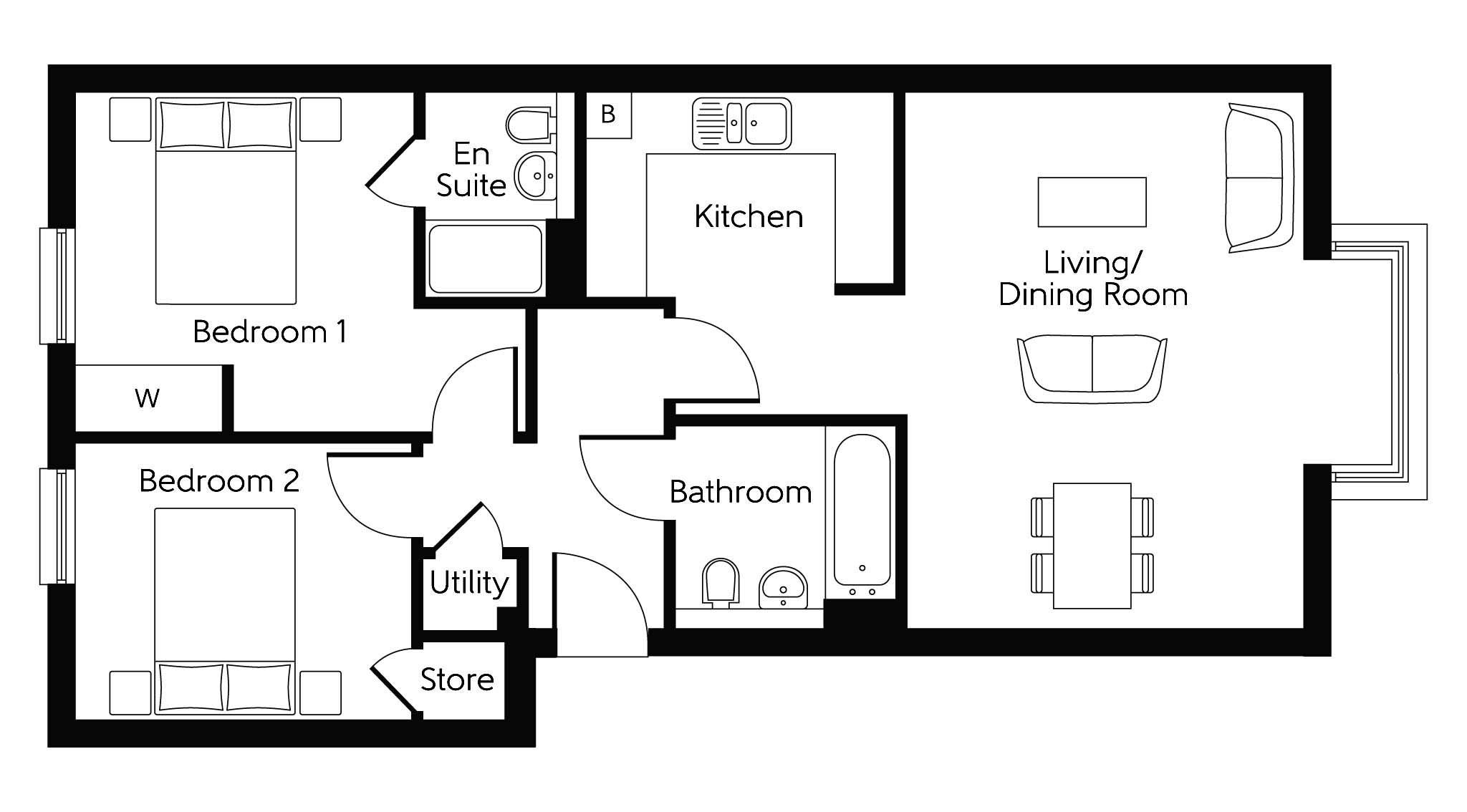 This appealing apartment has two double bedrooms - one that benefits from an en suite shower room and fitted wardrobe - a well-equipped family bathroom and an open-plan kitchen, living and dining area.