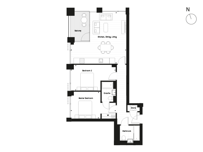 This dual aspect two bedroom apartment provides a perfect space for entertaining, offering a large open plan living/dining/kitchen area, leading out on to a private balcony. The shaker style fitted kitchen produced by Krieder comes complete with a selection of integrated Siemens appliances.