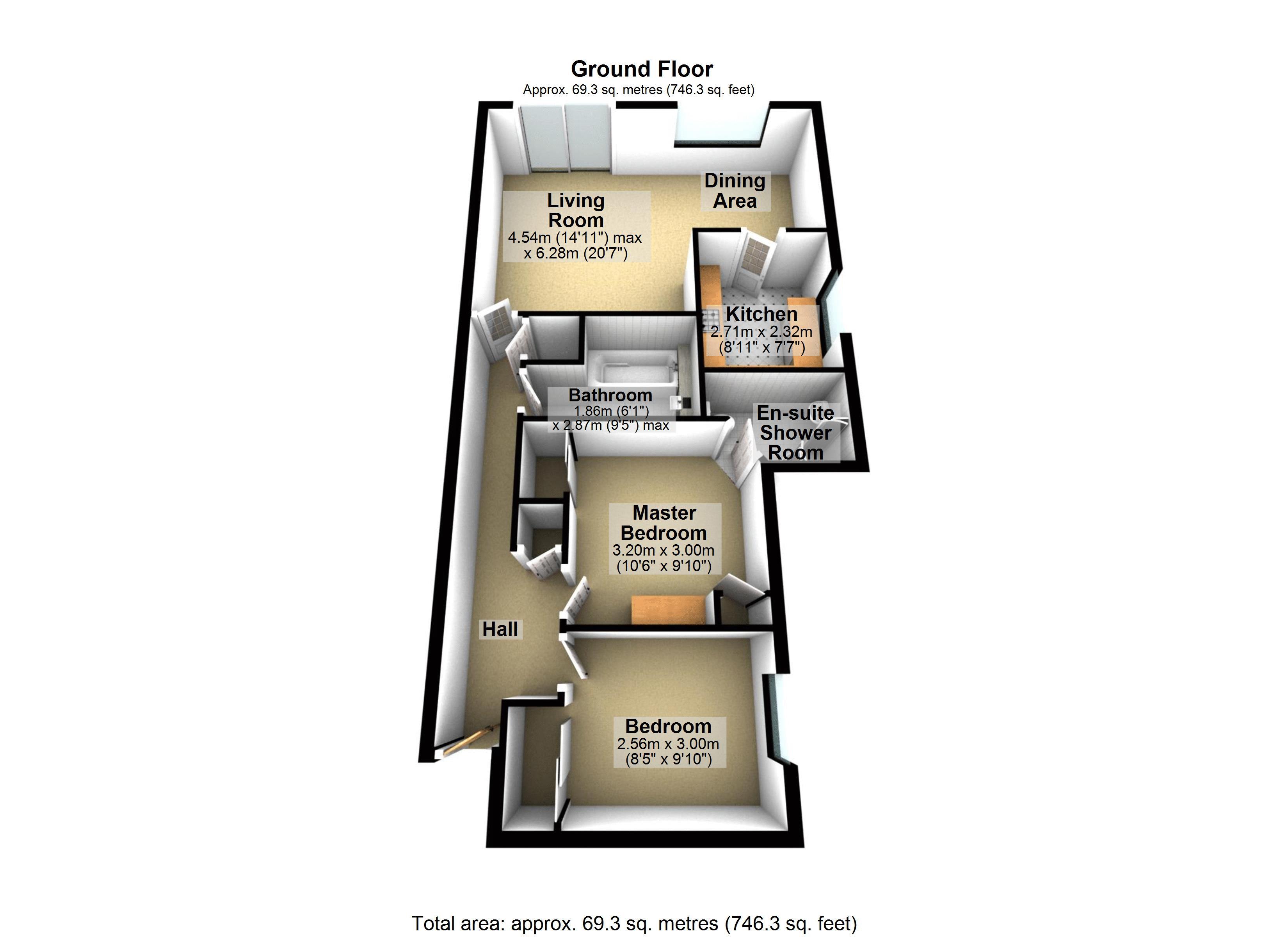 Super area, wood effect laminate flooring, UPVC double sliding patio door onto patio area, space for dining table, UPVC double glazed window, two radiators, two ceiling lights, door to kitchen.
