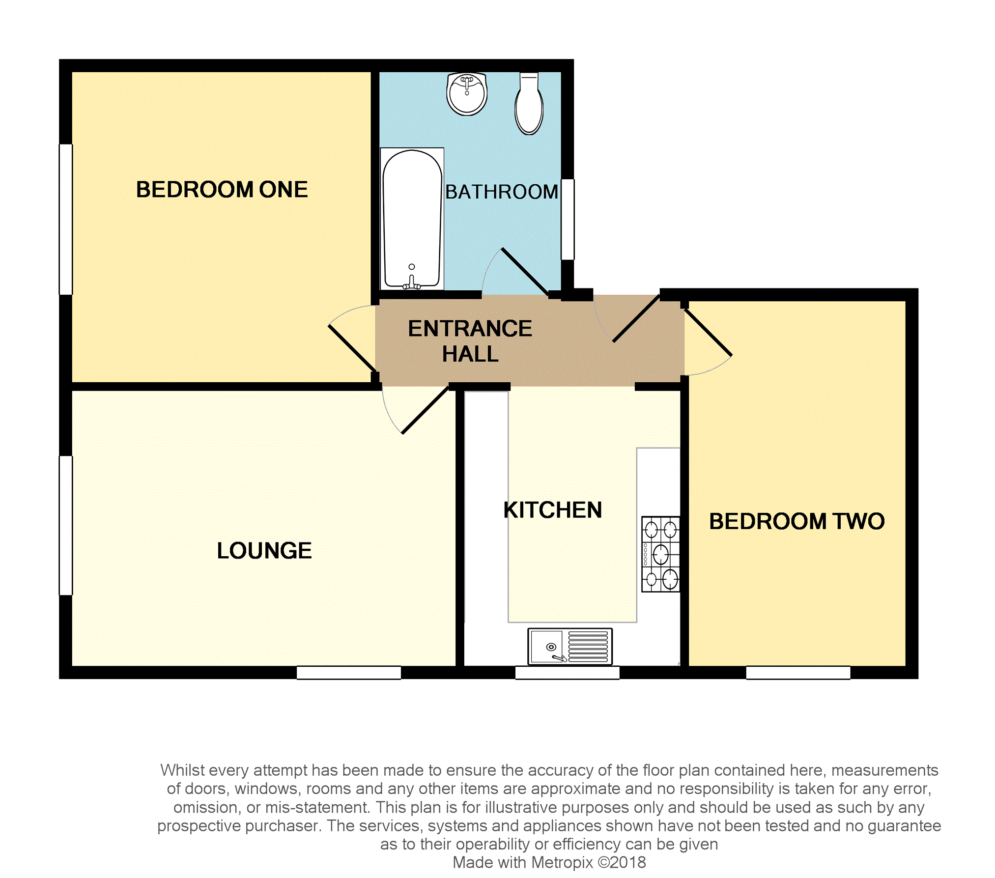 Having a range of wall and base units with laminate work surfaces, incorporating a stainless steel sink with mixer tap over and integrated oven and hob. Space and plumbing for washing machine and fridge freezer. Tiled walls and splashback, storage cupboard housing combination boiler and double glazed window to the front.