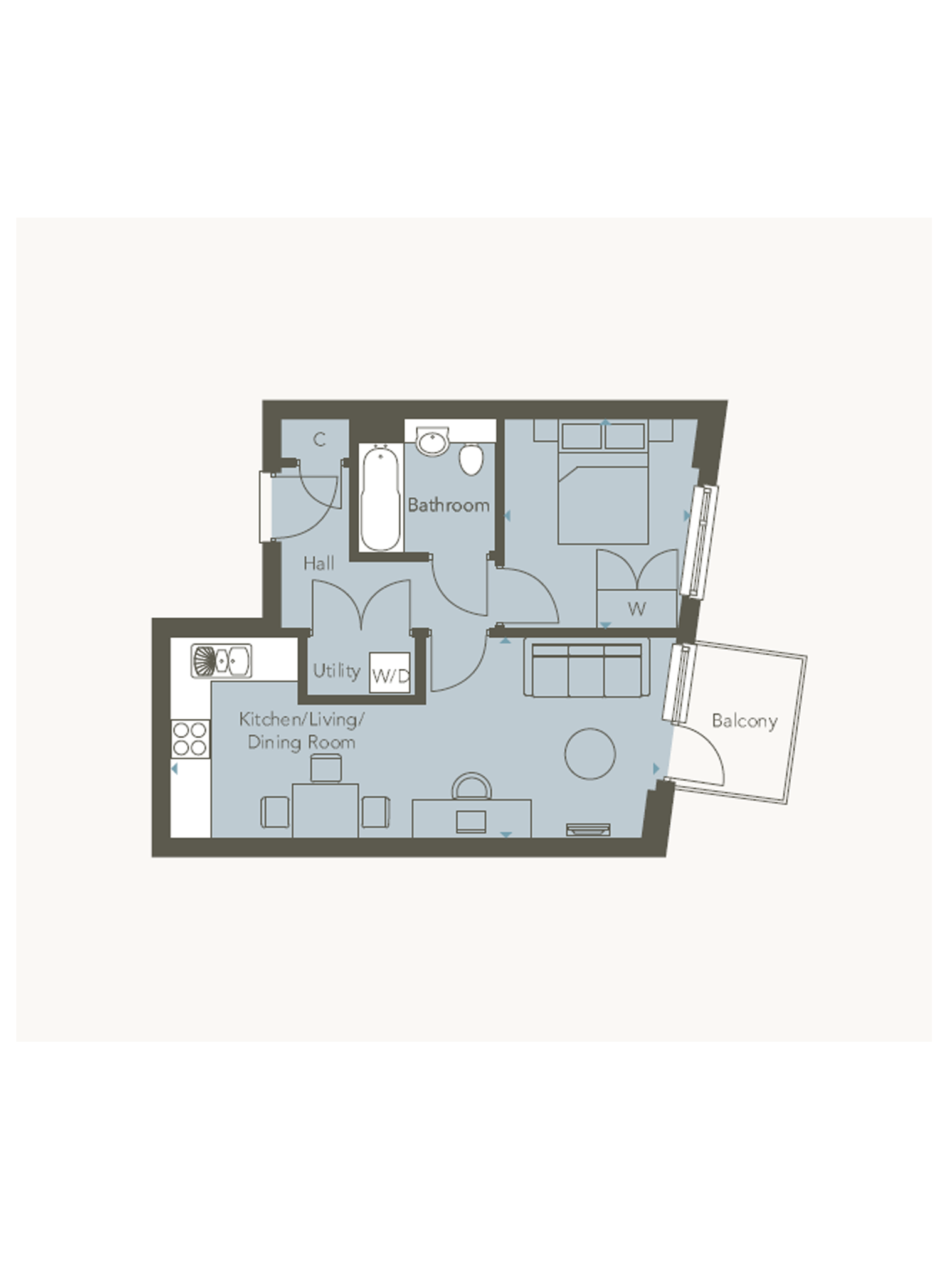 The apartments have been thoughtfully designed to maximise space and create light filled interiors with a variety of complementary finishes. Kitchen, dining and living areas are open plan with a light and airy feel. Bedrooms and bathrooms provide the perfect place to relax and unwind. A typical layout of the property includes an entrance hallway with a useful utility cupboard. The centrepiece of the home boasts an open plan kitchen, living and dining space. The modern kitchen has integrated appliances and composite stone worktops. The double bedroom has a built-in wardrobe and the internal accommodation is completed with a contemporary three piece bathroom. Balconies are also available.