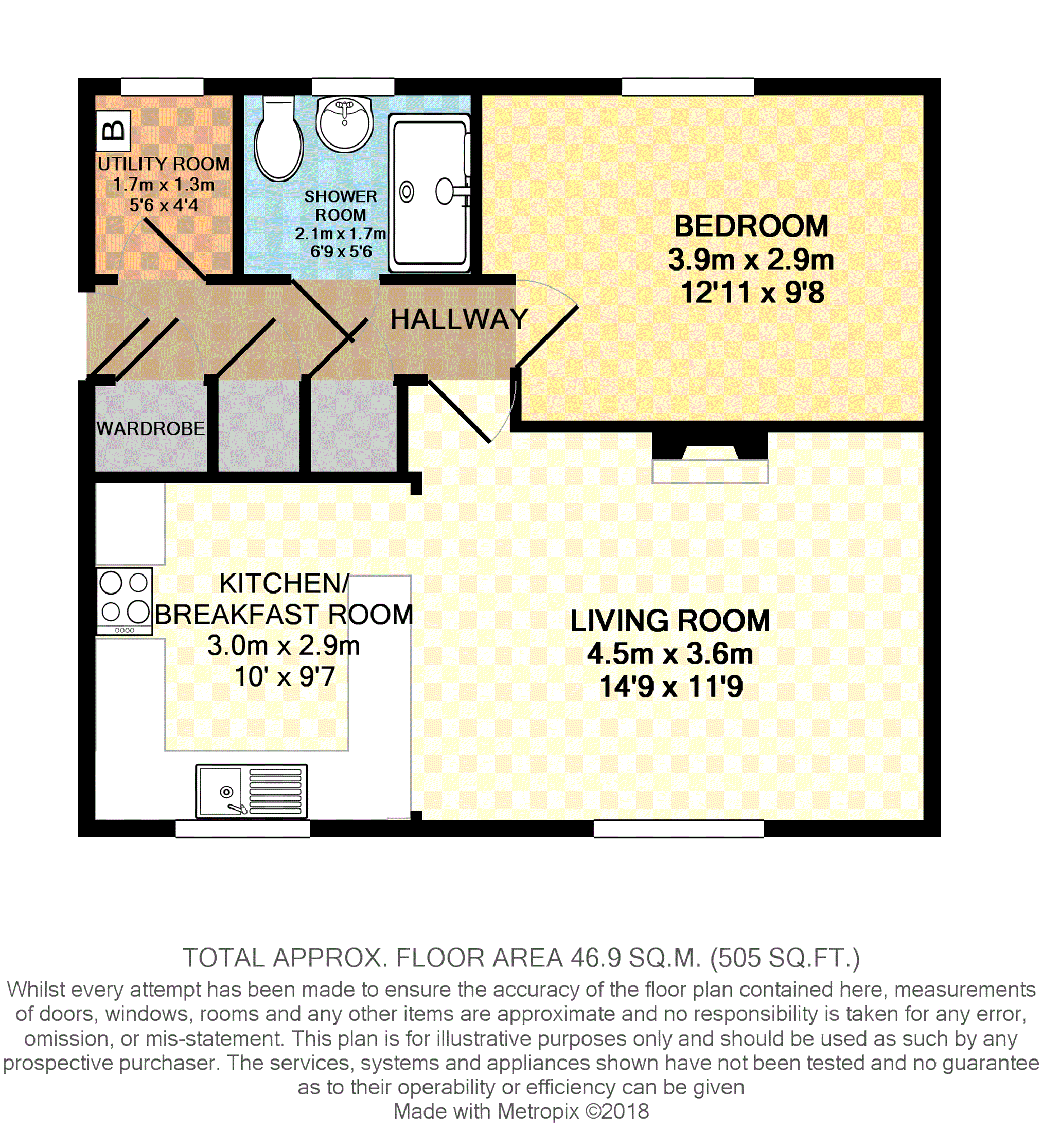 Entrance hall with three large storage cupboards/wardrobes, a small utility room, a spacious shower room, good sized double bedroom and a large bright open plan kitchen/living room with modern fitted kitchen and feature fireplace.