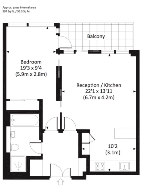 A luxury 1 bedroom apartment in prestigous Grosvenor Waterside is available to rent. The apartment has 1 double bedroom with fitted wardrobe, modern bathroom, fully fitted kitchen with all mod cons, wood flooring, a large south west facing private balcony . The apartment is in the exclusive development of Grovesnor Waterside. The development has the added benefits of a 24 concierge service, gym/spa, underground parking in the complex.