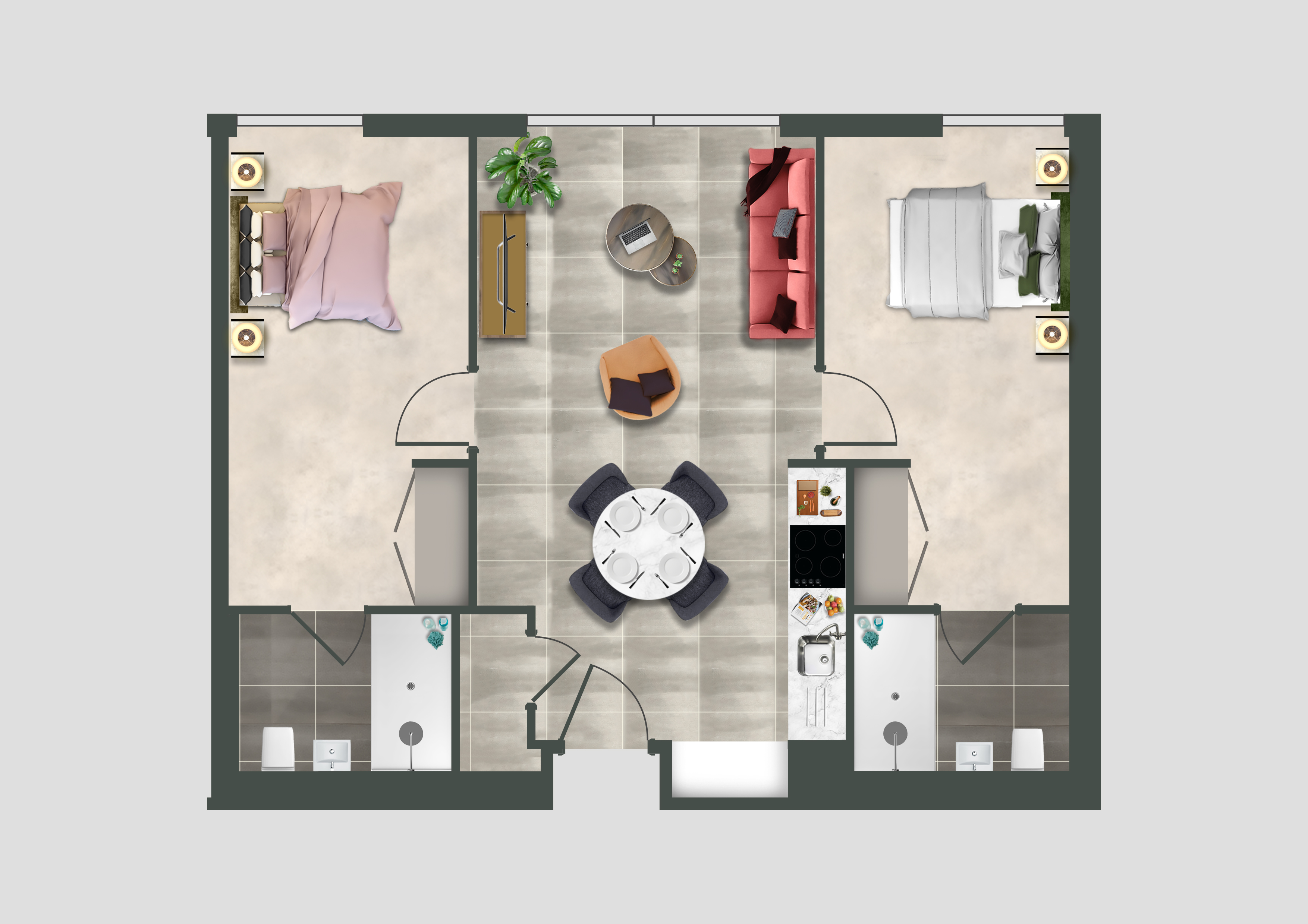 Two matching en-suite bathrooms with contemporary porcelain tiling throughout, deluxe rainfall shower, WC, heated towel rail and bespoke vanity cabinet with lighting.