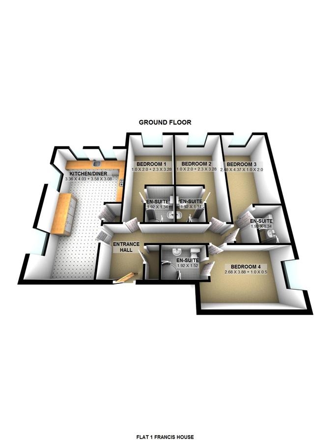 The state of the art accommodation benefits from a large kitchen/lounge area with LCD flat screen TV, 4 bedrooms comprising of an en-suite bathroom, single metal frame bed, double wardrobe, desk and chair, 4 drawer chest and bookshelf.