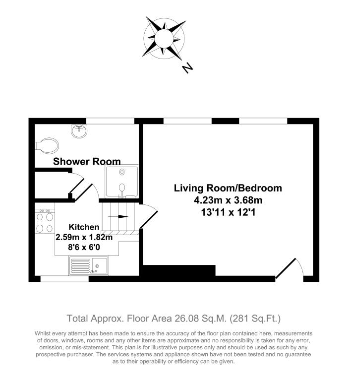 This good size flat features a spacious combined bedroom and lounge, a separate kitchen with white goods and washing machine and a bathroom with modern, stand-up shower.