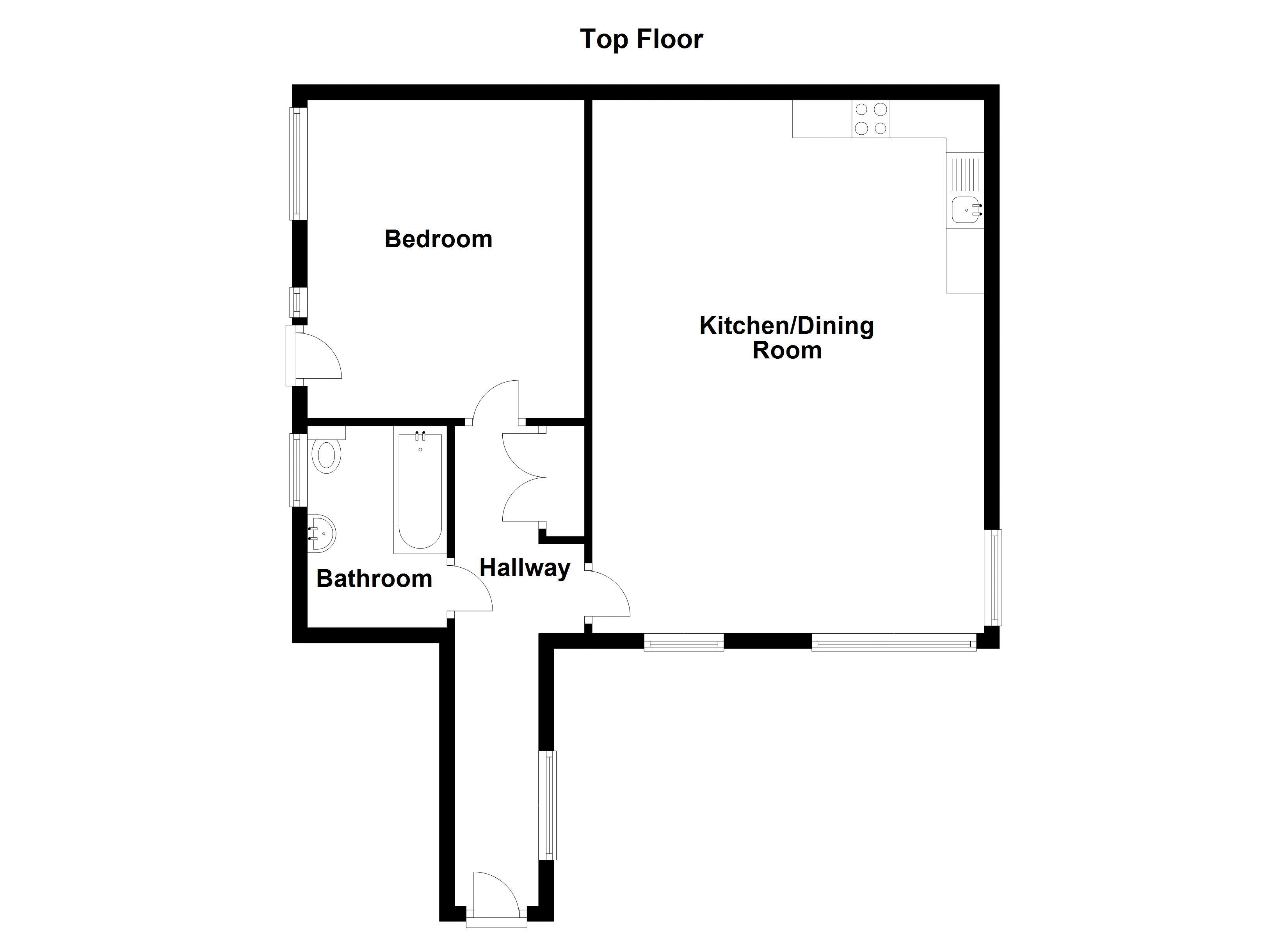 Modern open plan kitchen/living area with window to front and rear, radiators to both sides, fitted carpet to living area, tiled flooring to kitchen area with modern fitted kitchen comprising a matching range of base and eye level units with integrated mixer sink, washing machine, oven, four ring electric hob, extractor hood and free standing fridge/freezer.