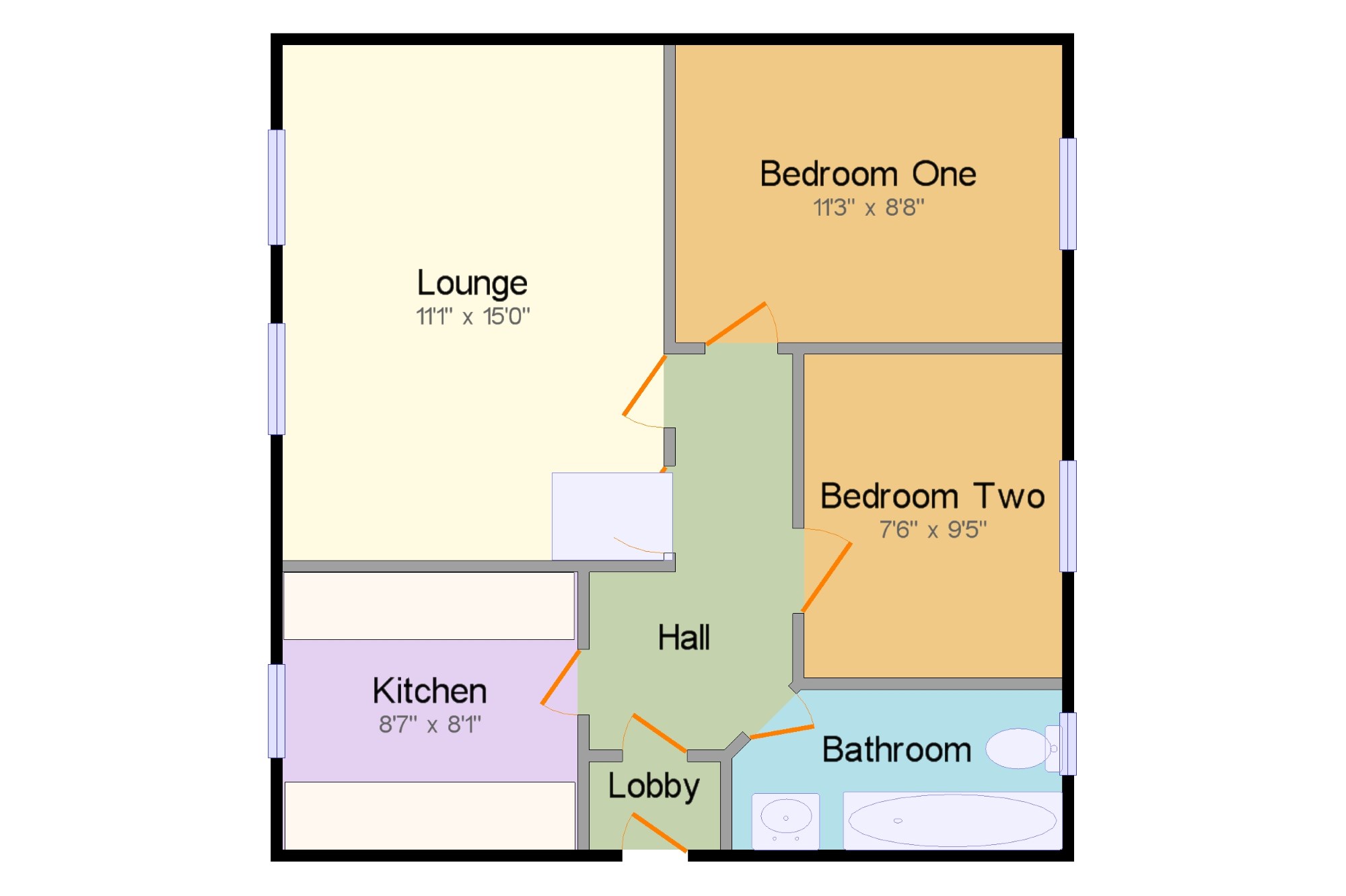Lounge11'1" x 15' (3.38m x 4.57m). Two UPVC double glazed windows to the front elevation and radiator.