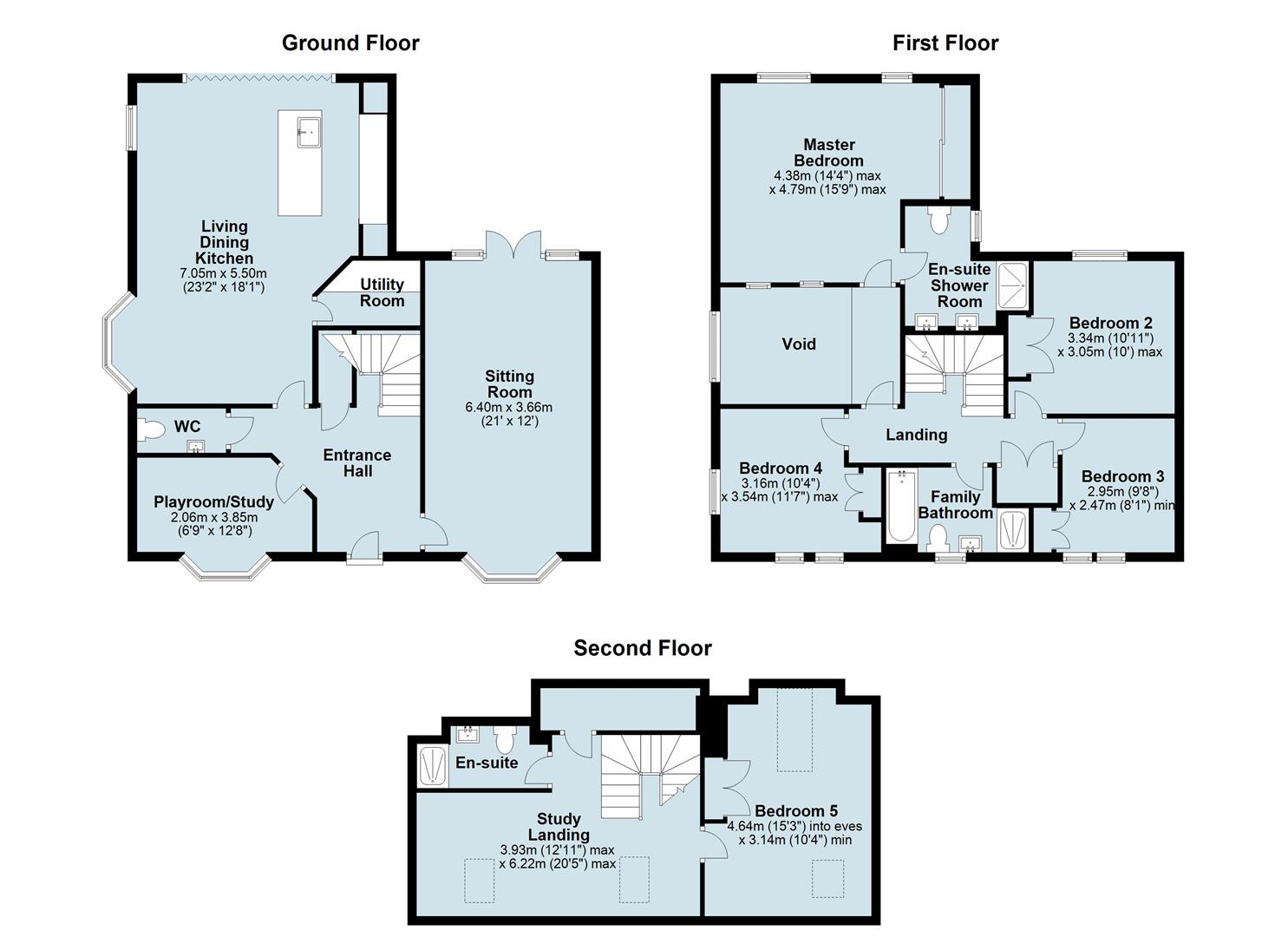 A Newstead design, of Davidson homes Tudor Rise Developments having five double bedrooms, study, family dining kitchen with Bi folding doors and double garaging. In brief, the property benefits hallway with access to the bay fronted study, WC/Cloakroom and sitting room. The family dining kitchen has granite topped worktops and breakfast bar, various integrated appliances, walk in bay window to the dining area, access to the utility room and Bi folding doors on to the rear gardens. First floor, the landing provides a views to the kitchen below. The master bedroom suite is has a walk in wardrobe with dressing area and a spacious en-suite shower room with twin wash basin and double shower. There are three further double bedrooms and a four piece family bathroom. The top floor houses a spacious landing which could be used as a study or play/family area and a further double bedroom and shower room. Outside, Double garage, gardens to the front and rear and a driveway.