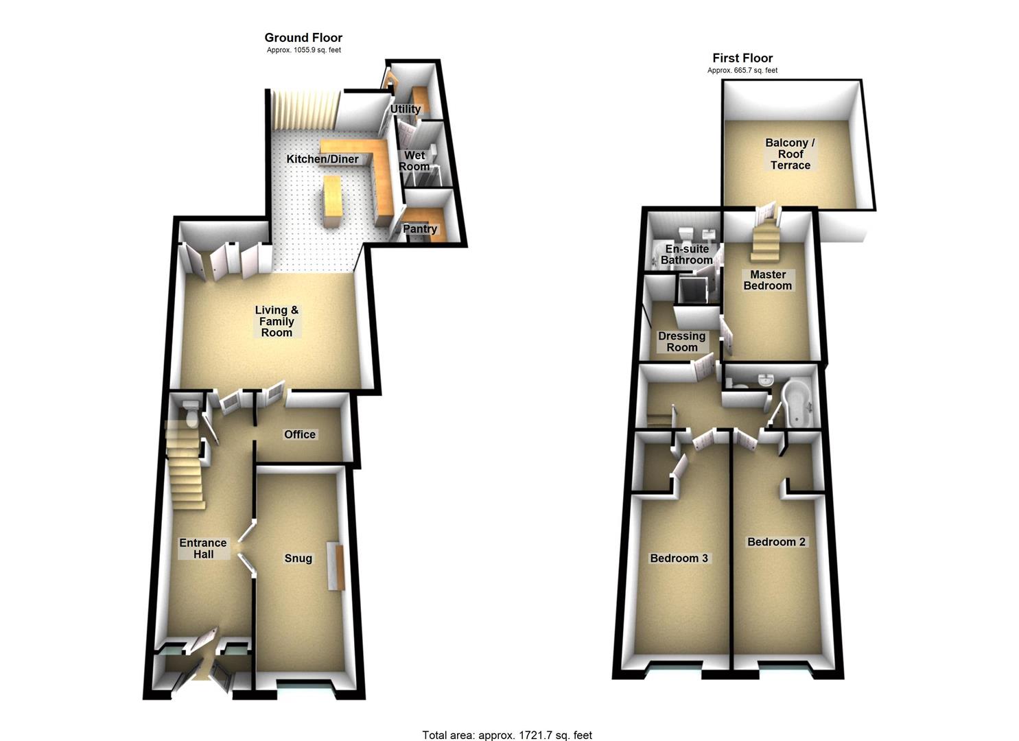 Internally the property has 3 bedrooms with access to the roof terrace, an en-suite bathroom with shower and a dressing room, there are two further bedrooms and two more bathrooms, along with four reception rooms, a lovely kitchen / family room with a roof lantern, with a pantry and utility room off, and then the Bi-fold doors take you out into the rear garden.