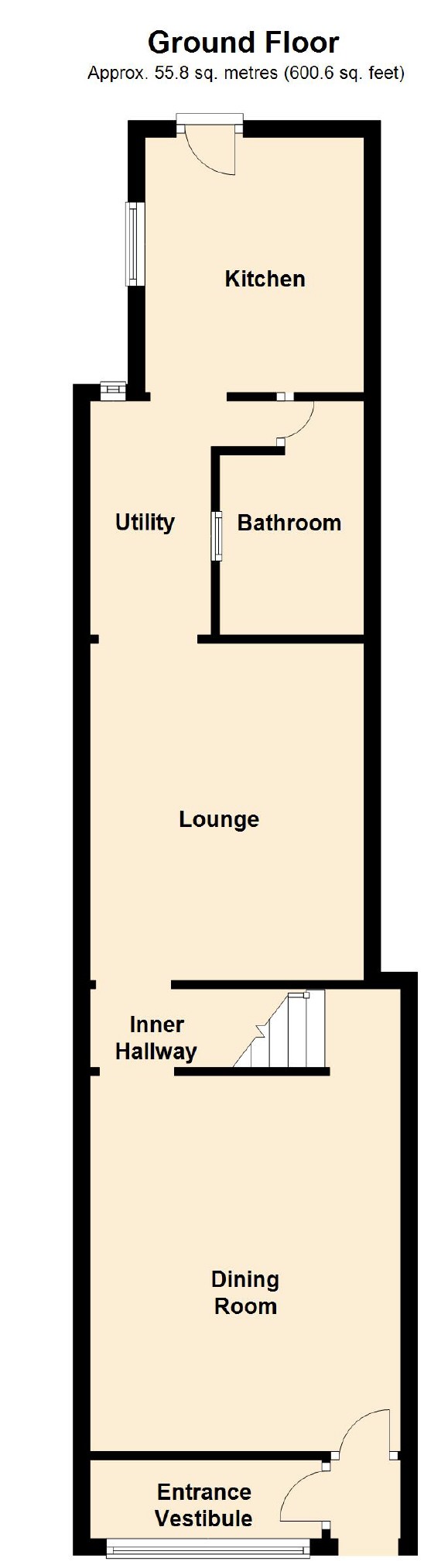 A versatile space having two central heating radiators, wooden door to the front elevation and two doorways, one leading to an inner hallway and one to the staircase to the first floor. Housing for the consumer unit.