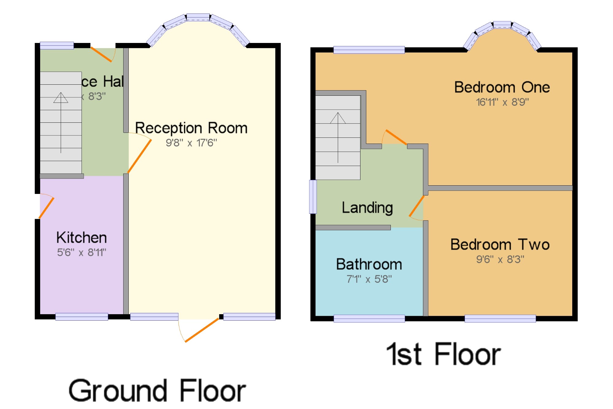 Bedroom One16'11" x 8'9" (5.16m x 2.67m). Double glazed uPVC bay window facing the front. Radiator, carpeted flooring, painted plaster ceiling, ceiling light.