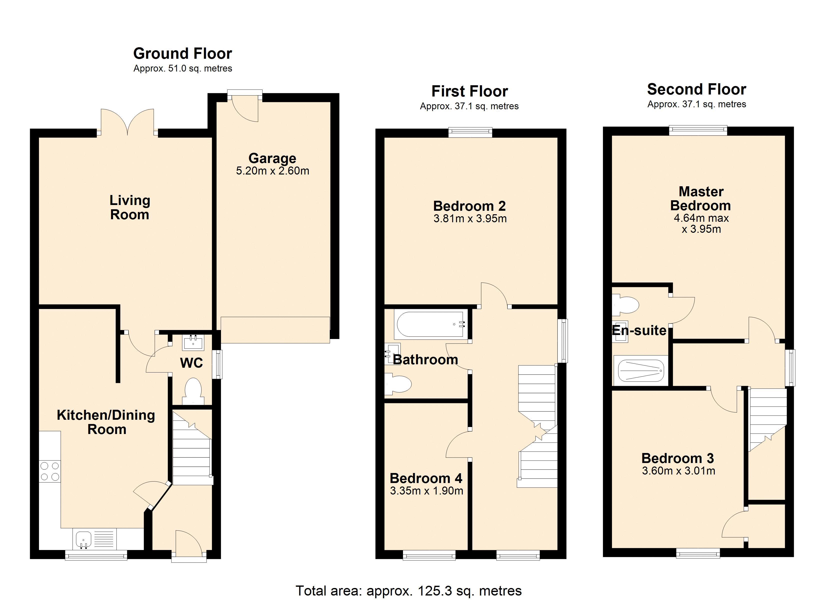 **there's so much bedroom space in this house type** Three storey end town house with attached garage and driveway providing off road parking. The location offers ease of access to local amenities such as schools, shops, supermarkets, leisure centre and pubs. The home benefits from having double glazing, central heating and is offered for sale with no onward chain. The accommodation flows with an entrance hall having stairs to the first floor, an open plan kitchen diner, a WC and a living room to the rear of the property with patio doors onto the garden. The first floor has two bedrooms and a family bathroom whilst the second floor has a further two bedrooms with the master bedroom having an en suite. Outside there is a driveway and garage to the side with an enclosed rear garden having a patio seating area, decked space and lawn with timber fencing. Be sure to book a viewing to appreciate the internal space........