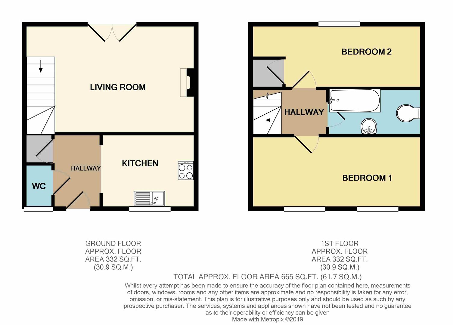 To the first floor the landing leads to two bedrooms, the master to the front is a good sized double room and the second is also of a good size. A three piece modern bathroom suite completes the layout, including a bath with overhead shower.