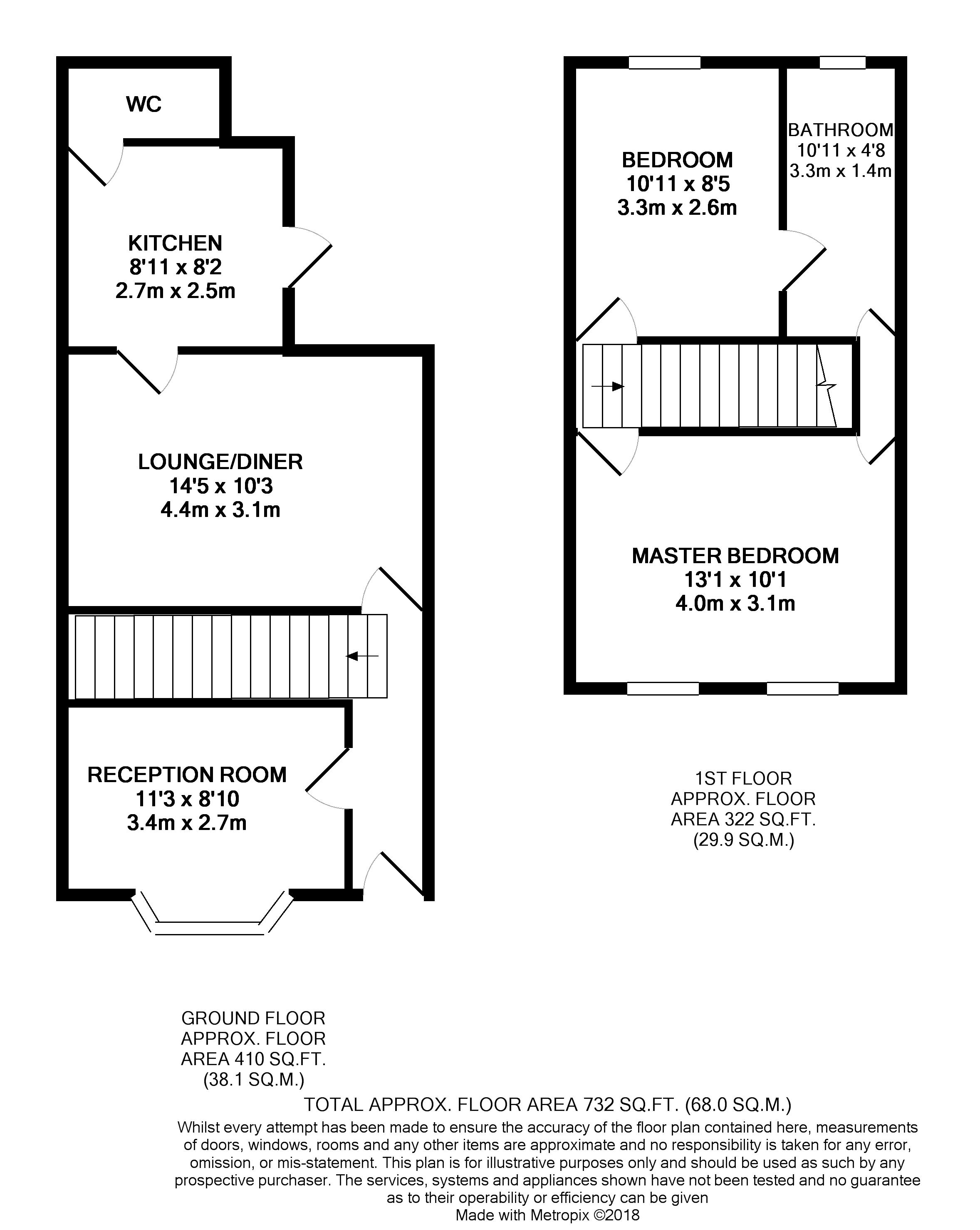 This charming two bedroom house comes with a large bay fronted reception which benefits from an original fireplace feature (untested), it also has its own separate dining area with a in-built storage space which is always handy for stocking up for whenever you find a bargain at the local supermarket. The property further benefits from having a separate kitchen with a spacious rear garden and a downstairs toilet. On the first floor you have the master bedroom which also has the luxury of having a fireplace (untested), in addition to a very unique Romeo and Juliet walk-through wardrobe which offers plenty of storage as well as a separate access leading to the bathroom . The first floor also consists of a double bedroom which has a lovely view to the rear garden as well as easy access to the three piece bathroom. The property benefits from high ceilings, original period features as well having plenty of natural light in the reception and master bedroom.