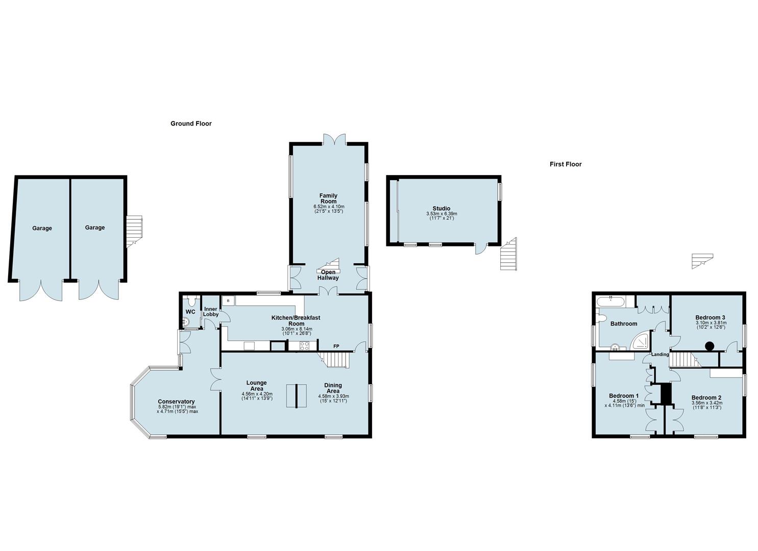 Located close to the main dwelling and suitable for conversion (subject to appropriate consents and approvals) is a substantial two storey double garage with studio office on the first floor. The garages enjoy twin double door access with light and power supplies, whilst the unique studio office above has an external staircase access and spoke wheel circular windows.