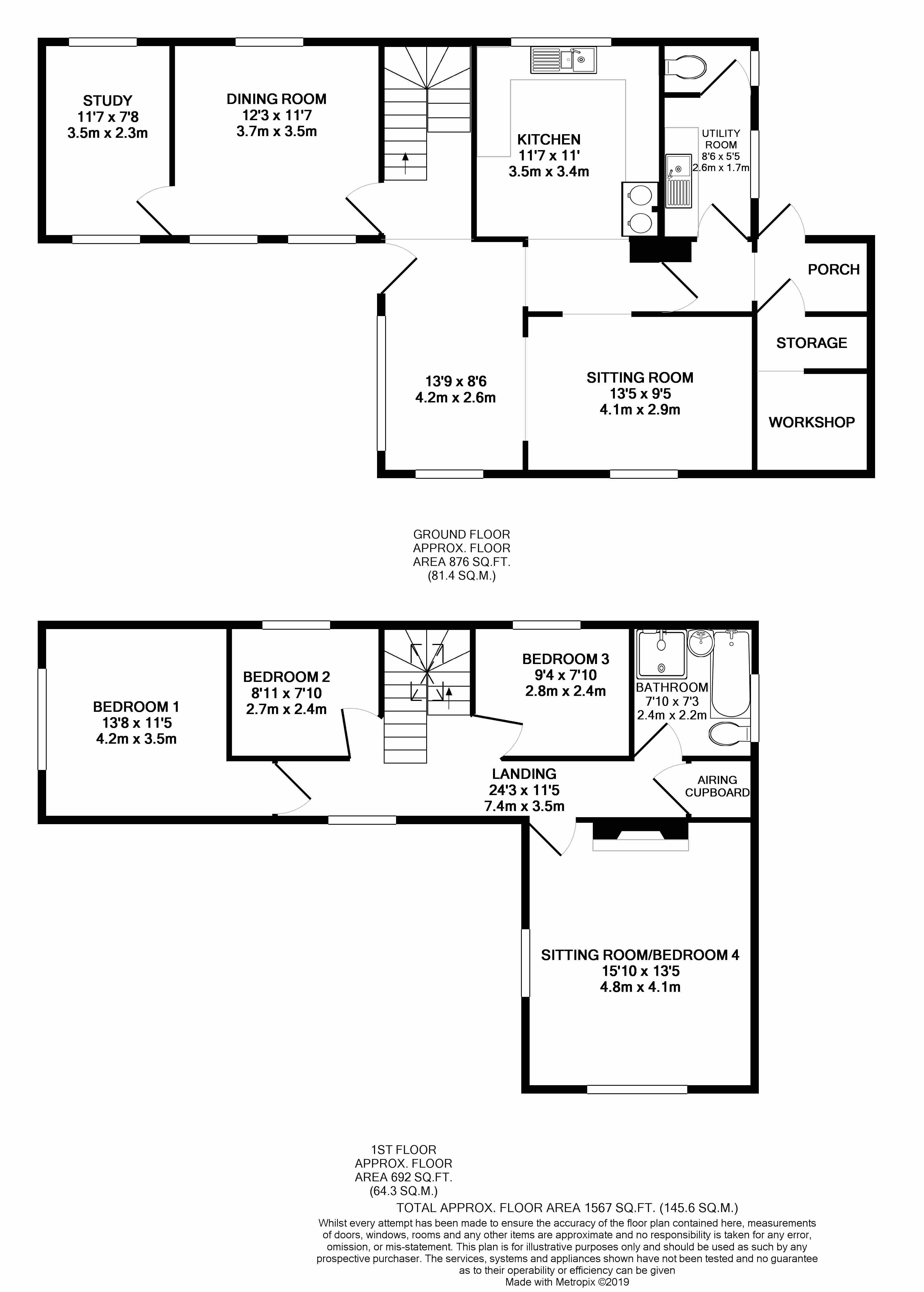 A turn-back staircase leads to the first floor with a Velux roof light over. The first floor comprises a central hallway which links the three double bedrooms, which all offer good sized rooms. The bathroom is at the end of the hallway and comprises bath and shower cubicle, WC and hand basin. Adjacent to the bathroom at the end of the hallway is the airing cupboard with immersion heater for the hot water. The final room on the first floor is a large lounge area with heating in the form of a wood burning stove and dual aspect windows with views over the garden and south over farmland.