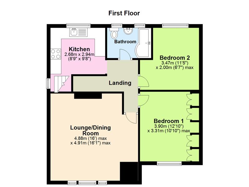 Kitchen (8' 10" x 9' 8" or 2.68m x 2.94m)