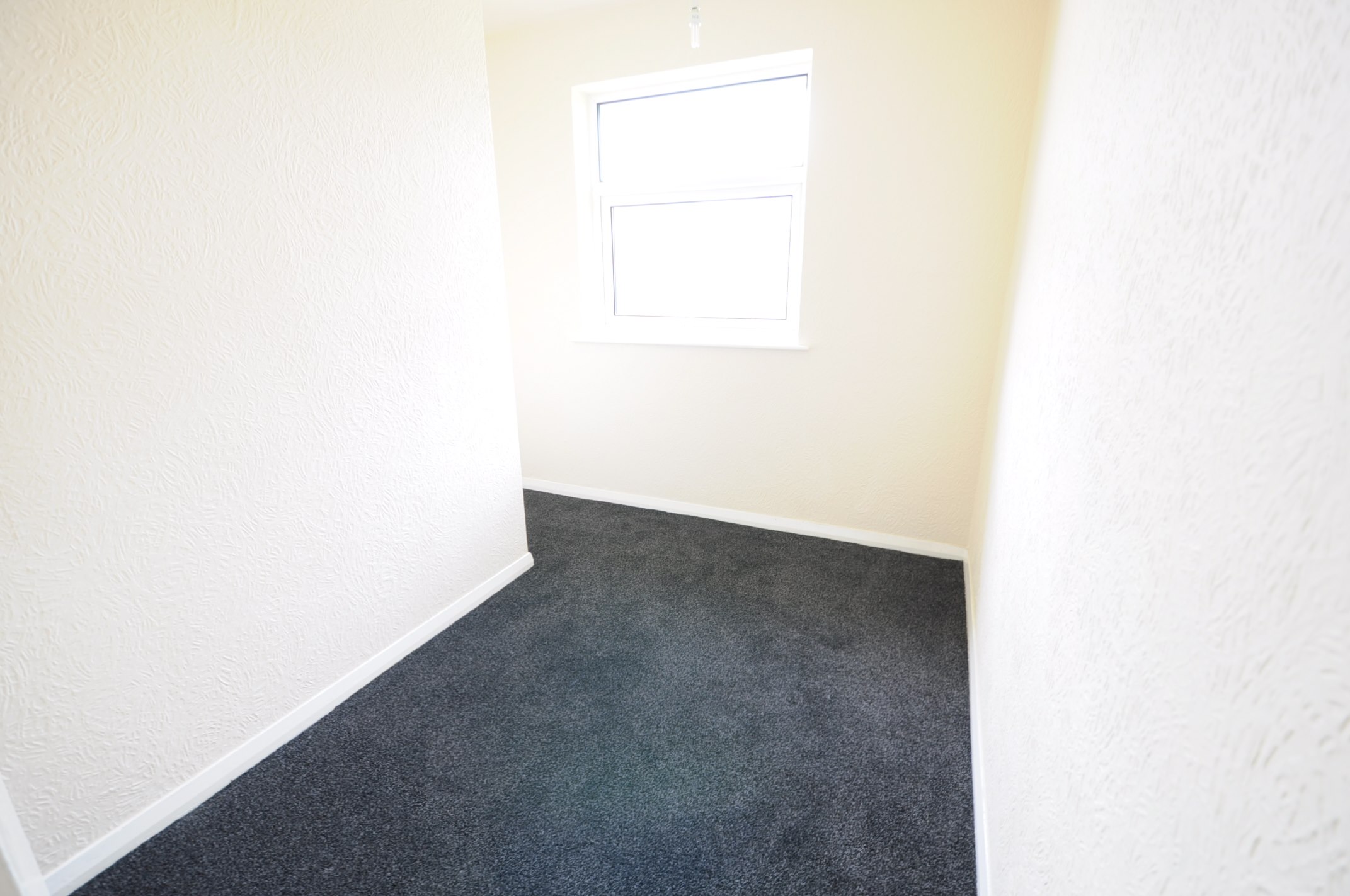 Single sized bedroom with white walls and grey carpets.
