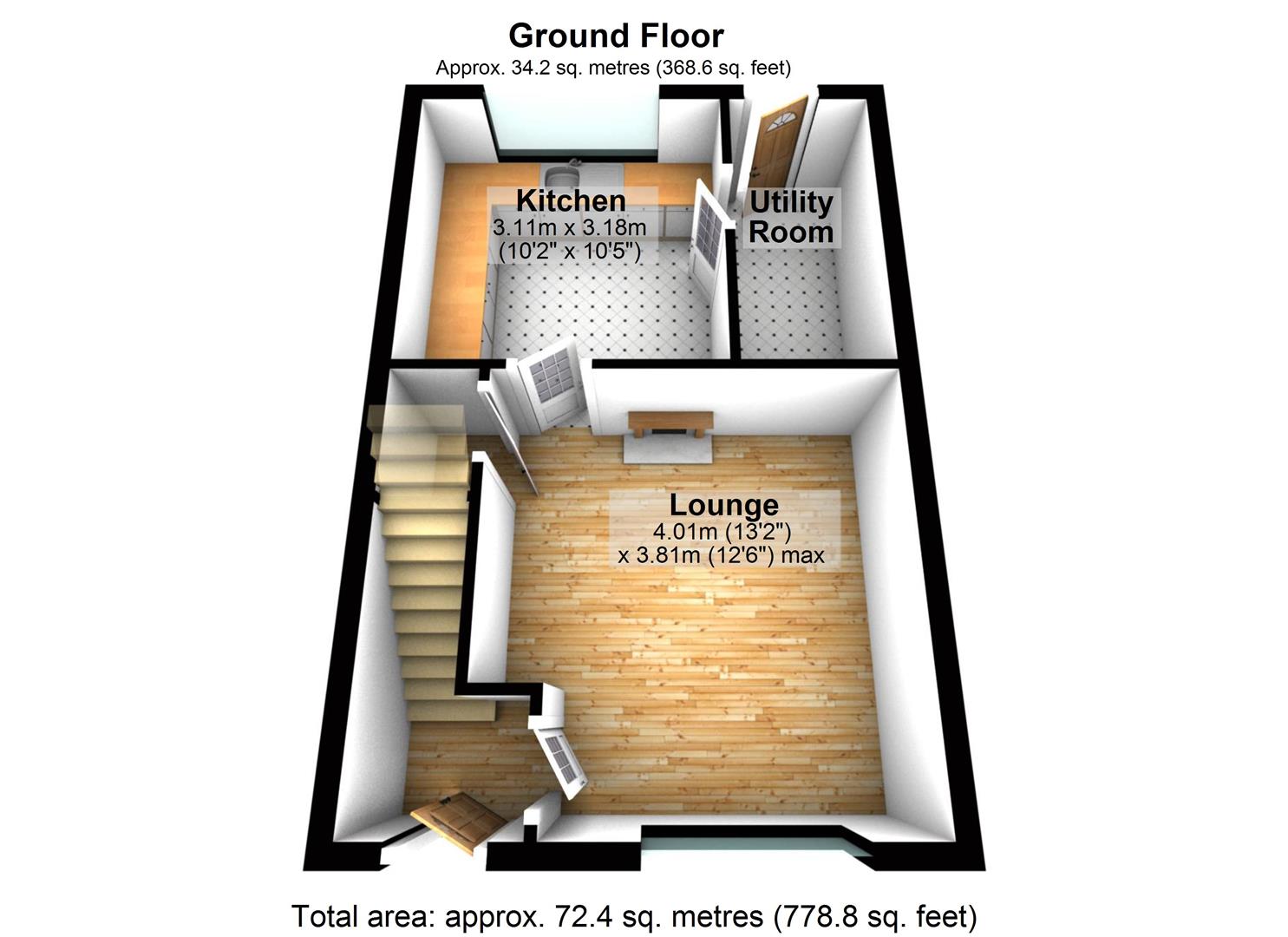 Door to front, stairs to first floor, door to: