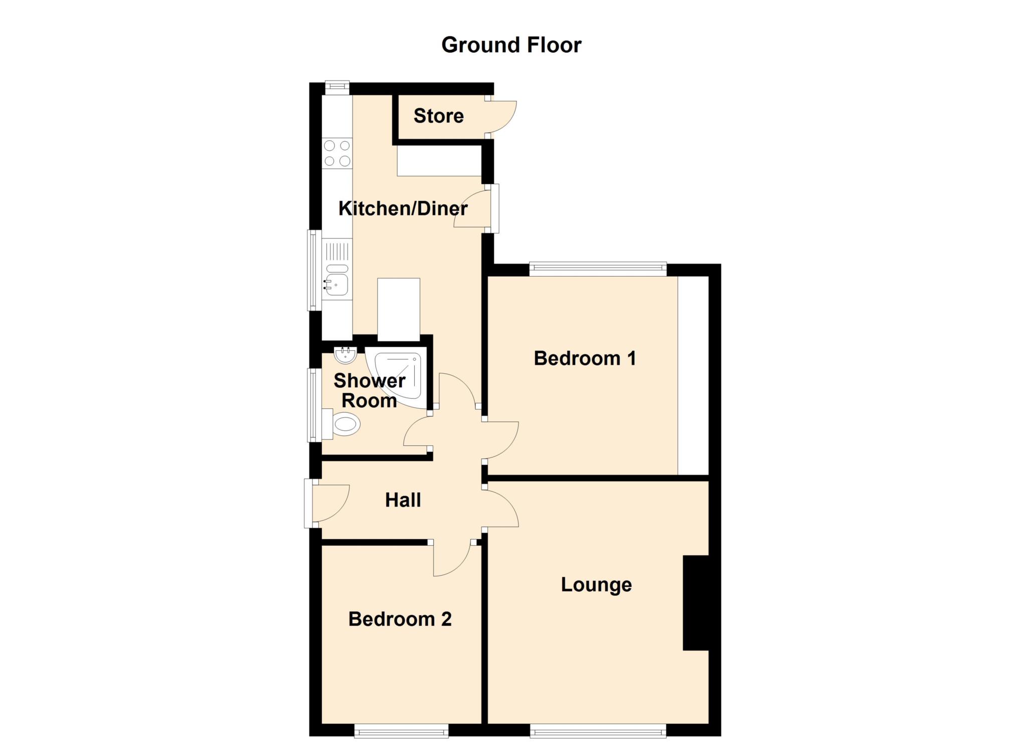 Fitted with a matching range of wall and base units with work top space over, ceramic sink unit, breakfast bar, electric oven, ceramic hob, extractor hood, vinyl flooring, radiator, double glazed windows, doors to rear garden.