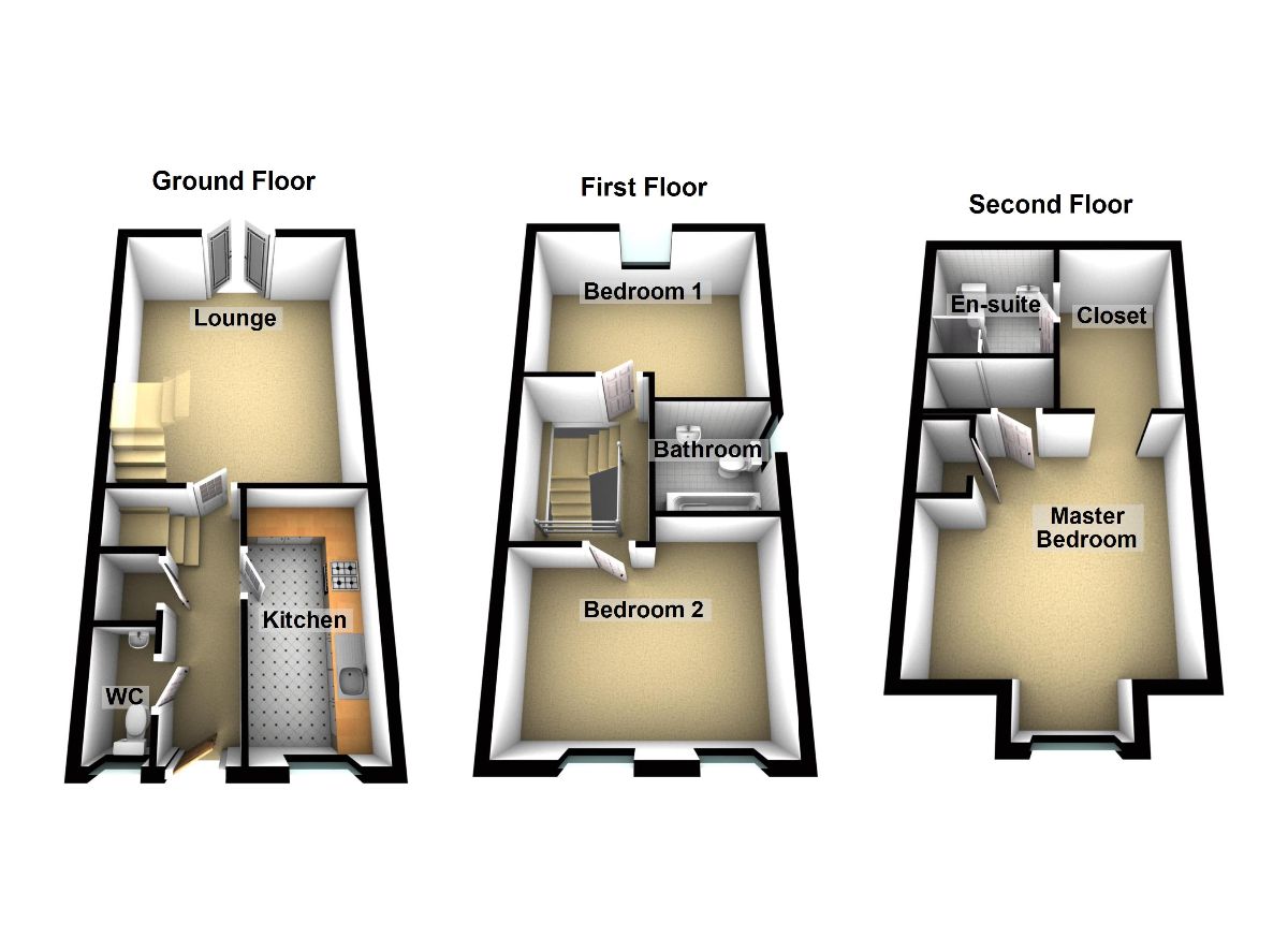 The property on offer is over three levels and comprises entrance hall, bright and modern fitted kitchen with ample storage and worktop surfaces, downstairs wc, and generously spacious modern lounge with patio doors leading onto rear garden.