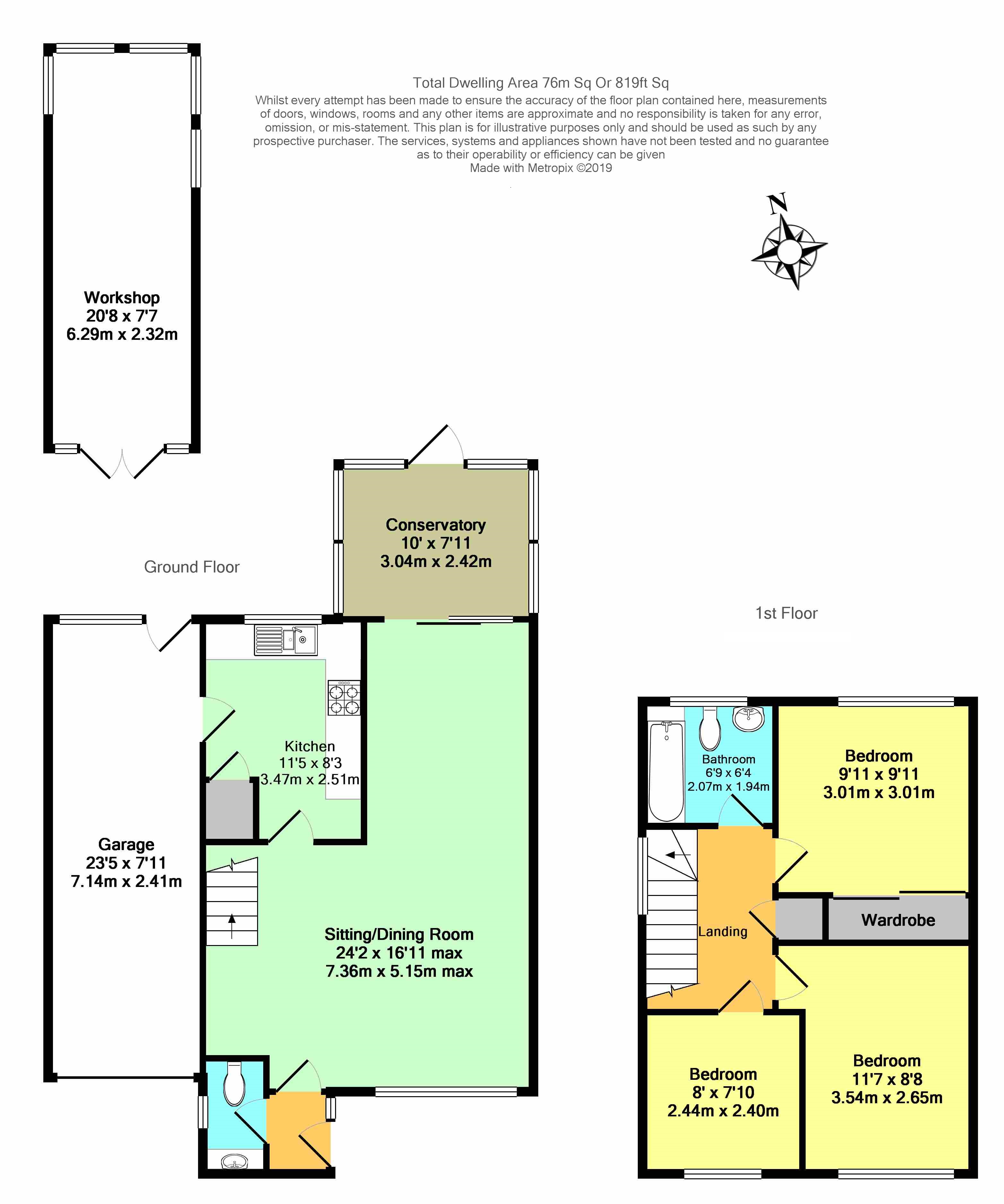 Garage 23'5 x 7'11. Up and over door to the front. Window to the rear and door providing access to the rear garden and also into the kitchen. Power and light connected.