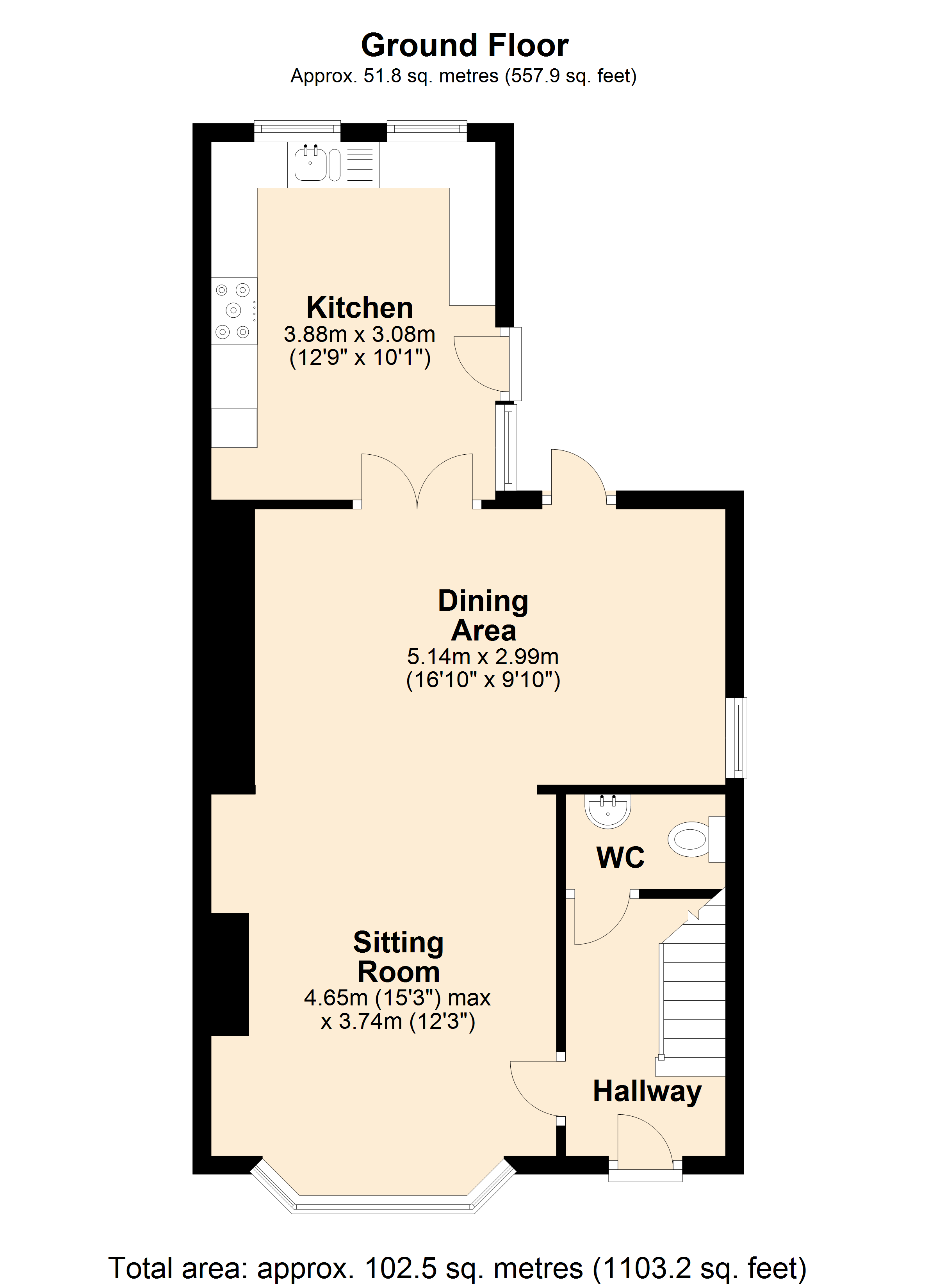 Living/dining room: 23’3” (excluding bay) x 12’2” (extending to 17’) A delightful light and airy room with an opening to the dining area which gives access to the kitchen and paved terrace ideal for al-fresco dining and entertaining. Attractive fireplace with fitted fireside shelving, large bay window to front aspect, two radiators, coved and smooth plastered ceiling with downlighters and double doors to: