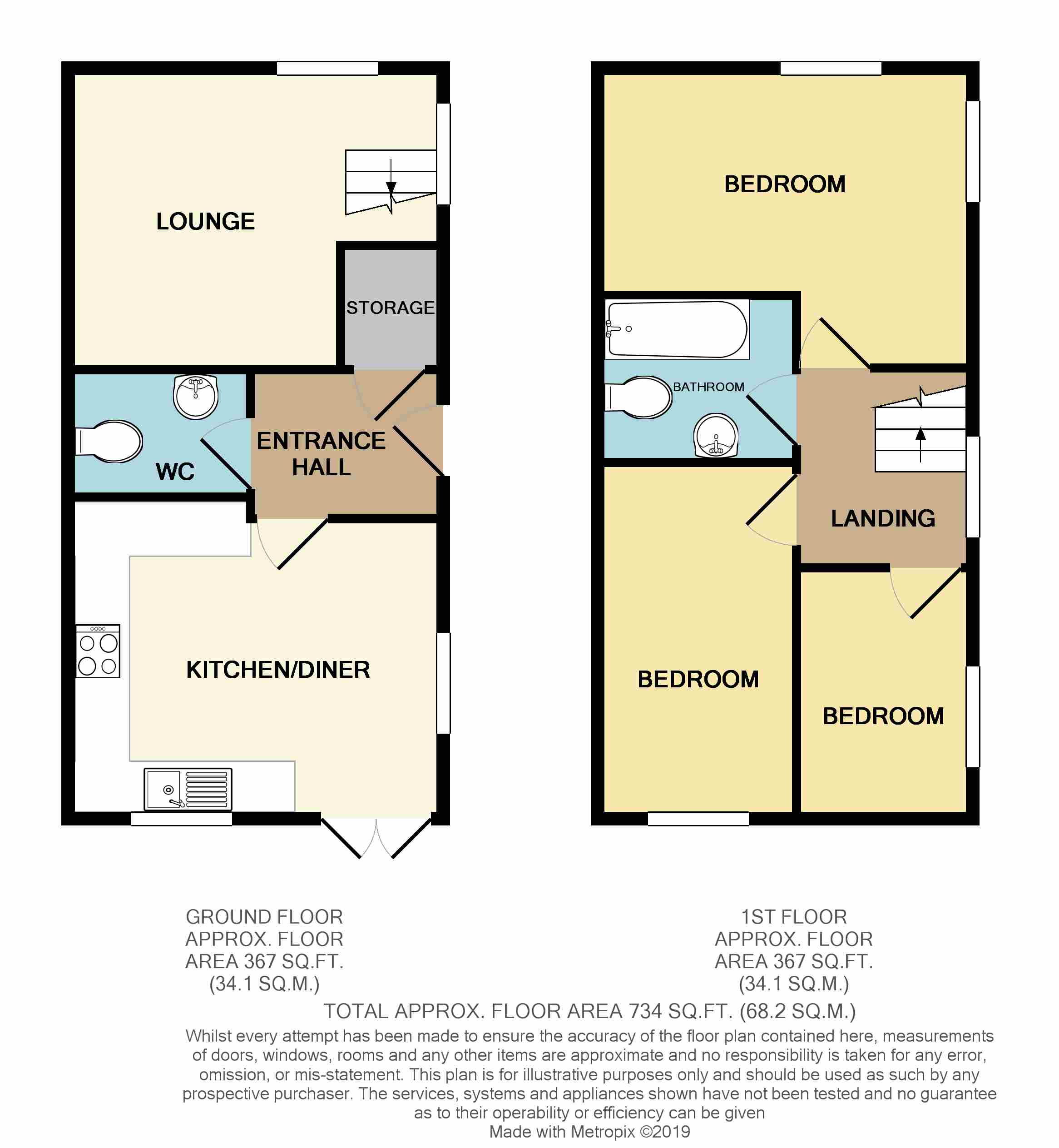 Description Set on a generous corner plot the property has off street parking to the rear for multiple vehicles. The low maintenance rear garden has a patio area with artificial grass and space for a shed. Internally the WC and a storage cupboard are off the hall with the dining kitchen to the rear. The kitchen has French doors leading to the rear garden area, fitted cabinets and space for a washing machine and dishwasher. The lounge has two windows providing lots of natural light and access to the 1st floor. The master bedroom has a king size bed and is neutrally presented. The bathroom has a white 3 piece suite and shower over the bath. To the rear of the property are two further bedrooms with one currently being used as an office but could house a single bed. The property is well presented throughout is deserving of internal inspection.