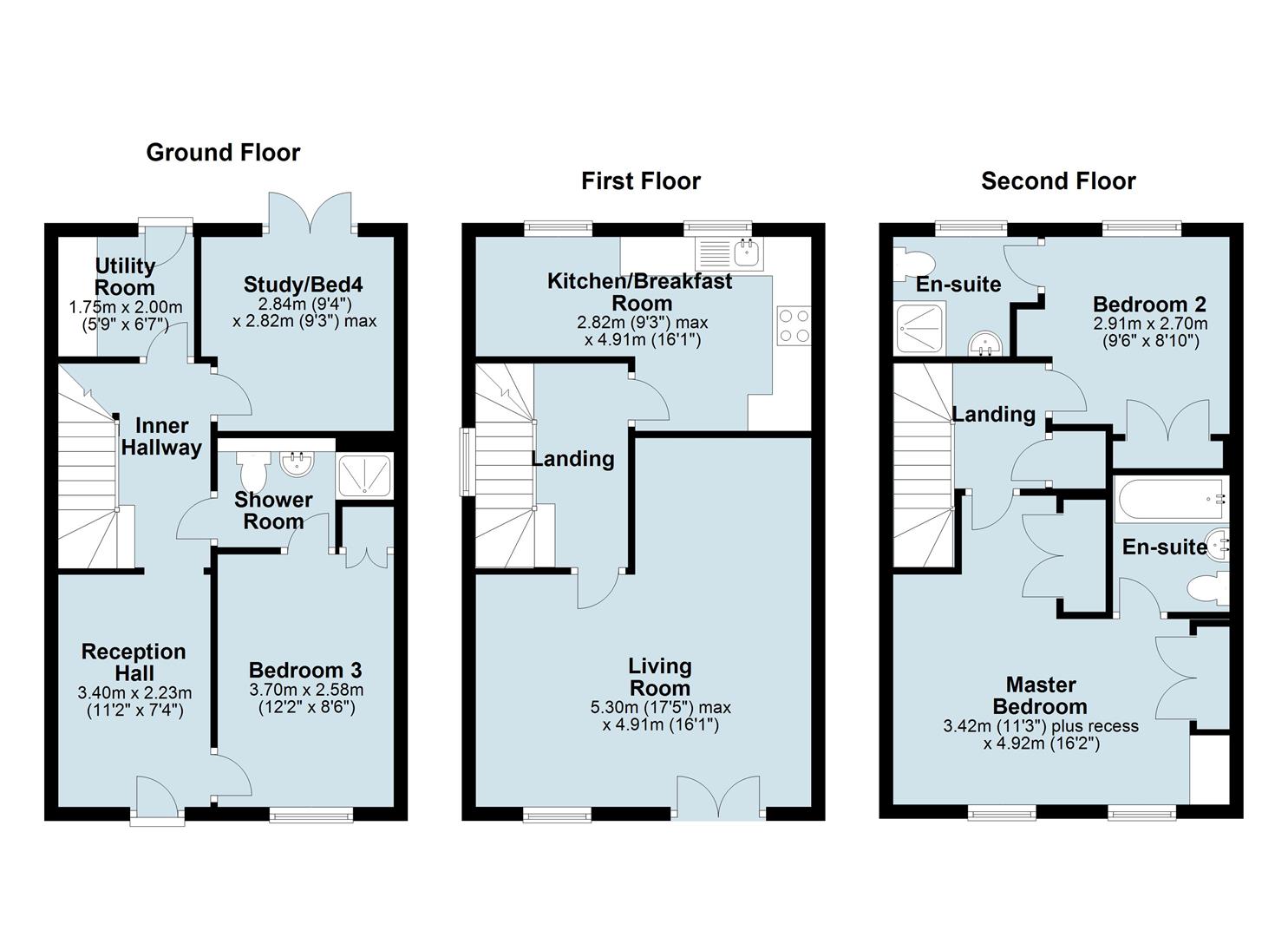 The first floor accommodation is dominated by the generous 17ft ‘L’ shaped lounge/dining room enjoying elevated views to the front elevation over Ravenstone Green with a Juliette balcony. To the rear elevation is a 16ft ‘L’ shaped breakfast/kitchen enjoying views over the landscaped south west facing rear gardens.